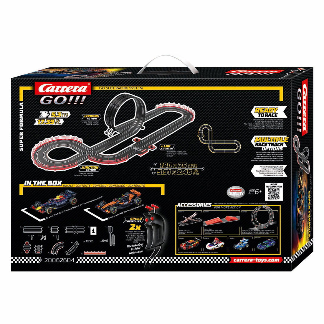 Mit der Carrera GO!!! Super Formula™ liefern sich Max Verstappen im Oracle Red Bull Racing RB21 „M. Verstappen, Nr. 1“ und Lando Norris im McLaren MCL39 „L. Norris, Nr. 4“ packende Duelle. Auf der 5,3 Meter langen Rennstrecke mit schnellen Geraden, spektakulären Kurven und einem Looping erleben junge Fahrer das Gefühl, Teil der Formel-1-Welt zu sein. Die detailgetreuen Fahrzeuge wecken echtes Rennfieber, während spannende Kopf-an-Kopf-Rennen und Überholmanöver den Adrenalinspiegel in die Höhe treiben. Die Überlegenheit eines Weltmeisters trifft auf den Kampfgeist eines aufstrebenden Talents – dieses Set bringt Geschwindigkeit, Action und puren Wettkampfgeist auf die Rennstrecke. Perfekt für alle, die den Nervenkitzel der Formel 1 lieben!