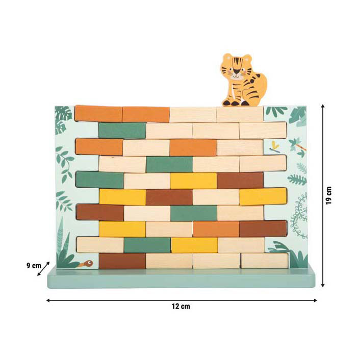 Wackeliger Spielspaß im Safari-Look! Mit den praktischen Holzhämmern gilt es, Stein für Stein aus der stabilen Mauer zu schlagen. Volle Konzentration und eine ruhige Hand sind gefragt, damit die Mauer nicht wackelt. Denn wenn die Mauer einstürzt und der niedliche Tiger von seinem Platz fällt, ist das Spiel vorbei! Ein spannendes Geschicklichkeitsspiel aus 100 % FSC®-zertifiziertem Holz, das die Entwicklung von Motorik, Geduld und Konzentration fördert. Mit jedem Zug steigt die Spannung: Bleibt die Mauer stehen oder stürzt sie ein?