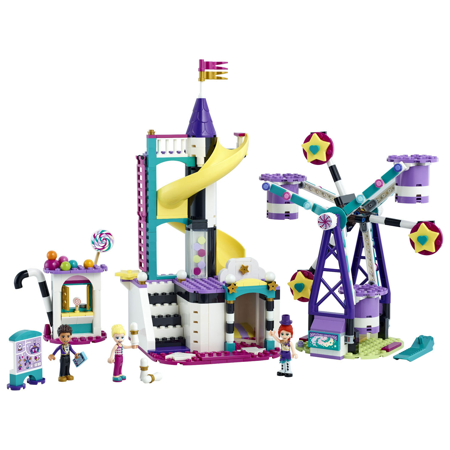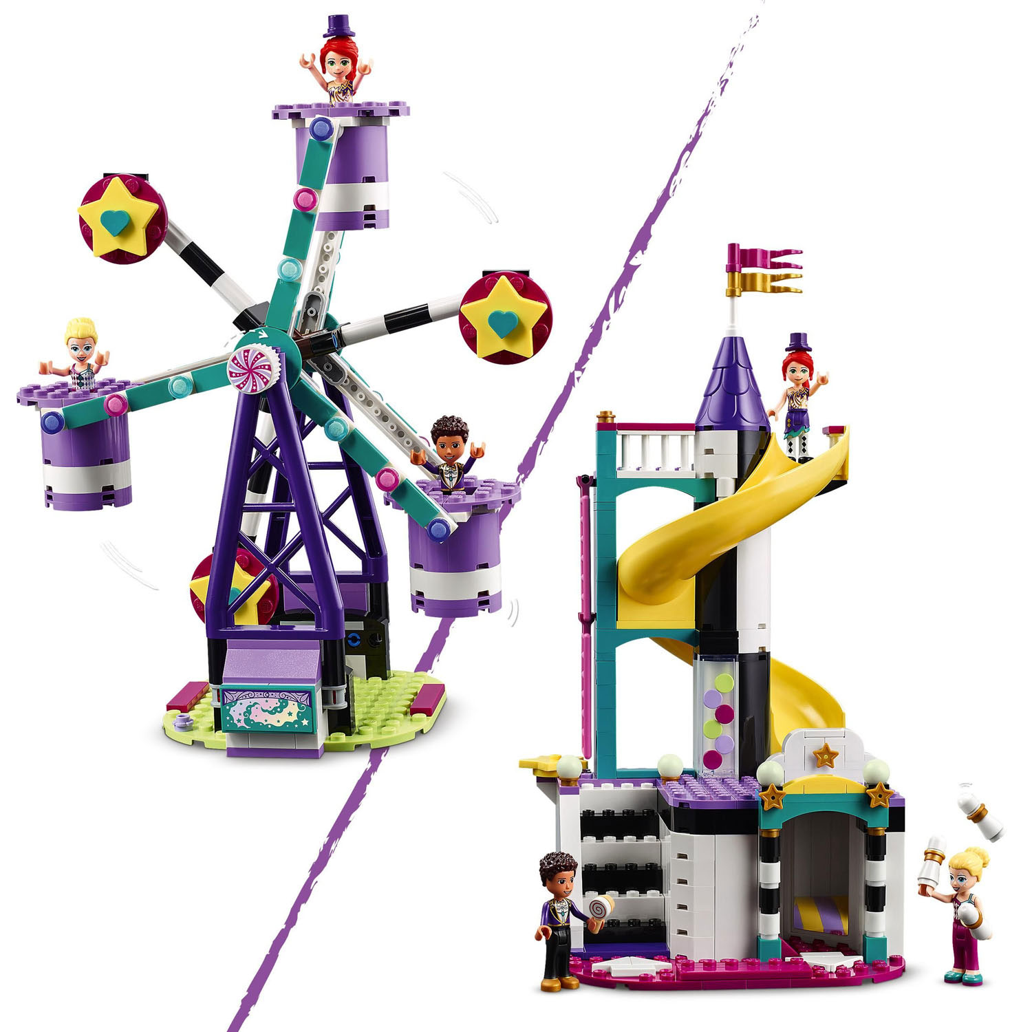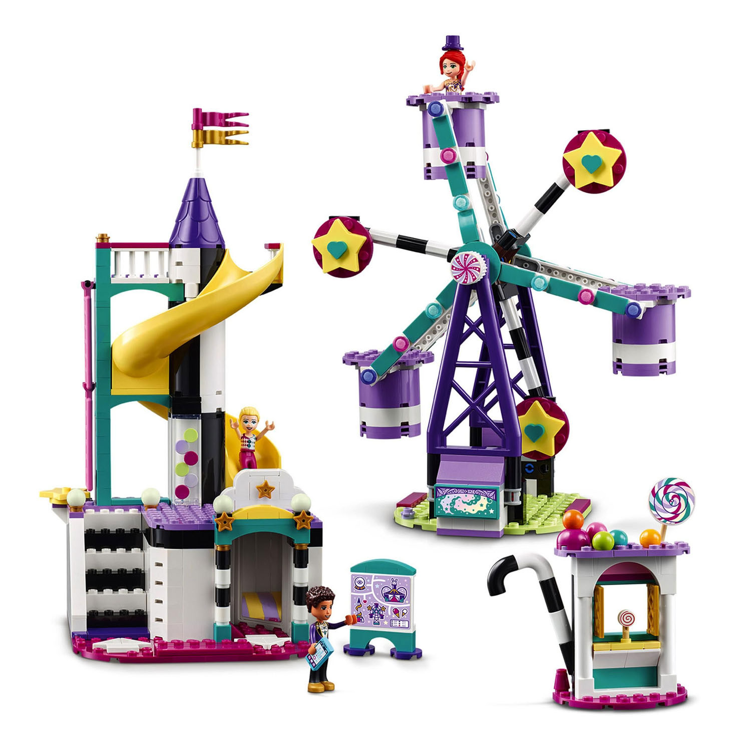 Kinder müssen nicht mehr warten, bis der Jahrmarkt in ihrer Nachbarschaft ankommt, um den Spaß des Jahrmarkts zu erleben. Das LEGO Friends Jahrmarktset „Magisches Riesenrad mit Rutsche“ (41689) bringt jeden Tag den Spaß des Jahrmarkts in die Zimmer. Sie können das hübsche Riesenrad mit seinen niedlichen lila Zylinder-Autos drehen, am Süßigkeitenstand Süßigkeiten verkaufen und die Menge mit ihren Kartentricks unterhalten. Kinder werden verzaubert sein, wenn die Jahrmarktbesucher auf der magischen Rutsche verschwinden! Sie werden ihre Familie mit dieser Verschwindenummer – genau wie ein echter Zauberer – in Erstaunen versetzen. Mit diesem originellen Geschenk für sie oder ihn können Erwachsene gemeinsam mit ihrem Kind den Spaß des Jahrmarkts erleben und schöne Erinnerungen schaffen. Mit LEGO Friends Spielsets können Kinder die Spannung und den Spaß der echten Welt mit Freunden entdecken, die immer für sie da sind.<br><br>Das Riesenrad ist über 22 cm hoch, 18 cm breit und 12 cm tief. Die Rutsche ist über 28 cm hoch, 14 cm breit und 15 cm tief.<br><br>Enthält 545 Steine.