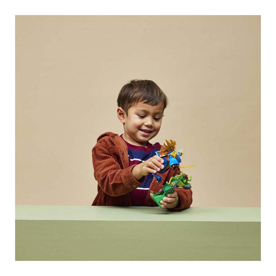 Mit diesem coolen Mech-Spielzeug können Jungen und Mädchen ab 4 Jahren die Action aus der 4. Staffel der NINJAGO®-Fernsehserie „Der Drachenkampf“ nachspielen. Das LEGO® NINJAGO Abenteuer-Set „Jays Drachen-Mech-Kampf“ (71853) enthält 2 Mechs und 2 Minifiguren. Jays Drachen-Mech hat ein aufklappbares Minifiguren-Cockpit und bewegliche Teile wie Schwanz, Flügel, Arme, Beine, Körper und Finger. Der Mutationsmonster-Mech hat ebenfalls ein Minifiguren-Cockpit und bewegliche Tentakel, Arme, Beine und Oberkörper. Für noch mehr Spielspaß sind außerdem 4 austauschbare Waffen enthalten: 2 Schwerter, ein Speer und ein Paar Klauen. Dieses Ninja-Spielzeug ist ideal, um Kindern ab 4 Jahren die Freude am Bauen mit LEGO Steinen näherzubringen. Das Abenteuer-Set enthält einen Starter-Stein – eine teilweise vorgefertigte Basis, mit der Kinder schnell und sicher bauen können. Das Set besteht aus 107 Teilen.