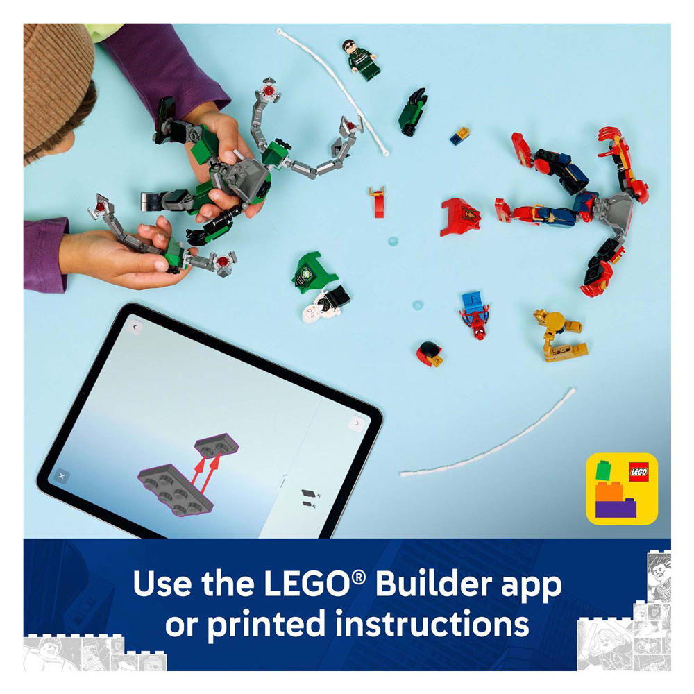 Mit dem Mech-Showdown: Spider-Man vs. Doc Ock (76338) Bauset für Jungen und Mädchen ab 6 Jahren können Kinder mit den beiden voll beweglichen Mechs actionreiche Superhelden-Abenteuer erleben. Die Kinder können die Mechs so positionieren, dass sie mit den LEGO® Marvel Minifiguren Spider-Man, Ghost Spider und Doc Ock fantasievolle Geschichten zum Leben erwecken. Jeder Mech ist voll beweglich für maximale Dynamik und verfügt über ein aufklappbares Minifiguren-Cockpit. Der Spider-Man-Mech ist im Iron-Spider-Stil gehalten und mit zwei beweglichen Shootern ausgestattet, die per Knopfdruck aktiviert werden. Der Doc-Ock-Mech besitzt vier bewegliche Tentakel. Außerdem gibt es zwei Netzfäden, die sich einfach an den Mechs und den Minifiguren befestigen lassen. Ghost Spider hat zudem Fäden, die an der Brust des Doc-Ock-Mechs befestigt werden können. Dieses LEGO Marvel Spider-Man Set ist ein tolles Geschenk. Mit der LEGO Builder App können Kinder sicher bauen, Modelle vergrößern, sie in 3D drehen und ihren Baufortschritt anhand leicht verständlicher digitaler Anleitungen verfolgen. Das Set enthält 315 Teile. MECHA VS. MECH-BAUSPIELZEUG – 2 voll bewegliche Mech-Anzüge und 3 LEGO® Marvel Minifiguren sorgen in diesem Bau- und Spielset für Kinder ab 6 Jahren für eine epische Superhelden-Schlacht. 3 LEGO® MARVEL MINIFIGUREN – Lass Spider-Man und Ghost-Spider gegen den Schurken Doc Ock in einem epischen Mech-Kampf antreten. SUPERHELDEN-MECH-ROLLENSPIEL – Die Mechs von Spider-Man und Doc Ock sind voll beweglich und bieten dynamische Spielmöglichkeiten. Ihre Cockpits lassen sich für die Minifiguren öffnen. LEGO® ACTION-SPIELZEUG MIT ZUBEHÖR – Das Bauspielzeug enthält 2 Netzseile, 2 Shooter für den Iron Spider Mech, 4 bewegliche Tentakel für den Doc Ock Mech und 2 Schnüre für Ghost Spider. GEBURTSTAGSGESCHENK – Schenke einem jungen Superhelden doppelten Spaß zum Geburtstag mit dem LEGO® Marvel Mech-Showdown: Spider-Man vs. Doc Ock. Doc Ock (76338) Doppel-Mech-Bauset. MEHR SUPERHELDEN-MECHS – Kinder können Sammle und kombiniere verschiedene LEGO® Mech-Bausets (separat erhältlich), um die Superhelden-Abenteuer deiner Kinder zu erweitern. EINE WELT VOLLER LEGO® MARVEL SETS – Nimm Kinder mit auf fantasievolle Abenteuer mit berühmten Charakteren und actionreichen Szenen aus den Marvel-Filmen. ABMESSUNGEN – Der Spider-Man-Mech in diesem 315-teiligen Bauset ist über 13 cm groß.