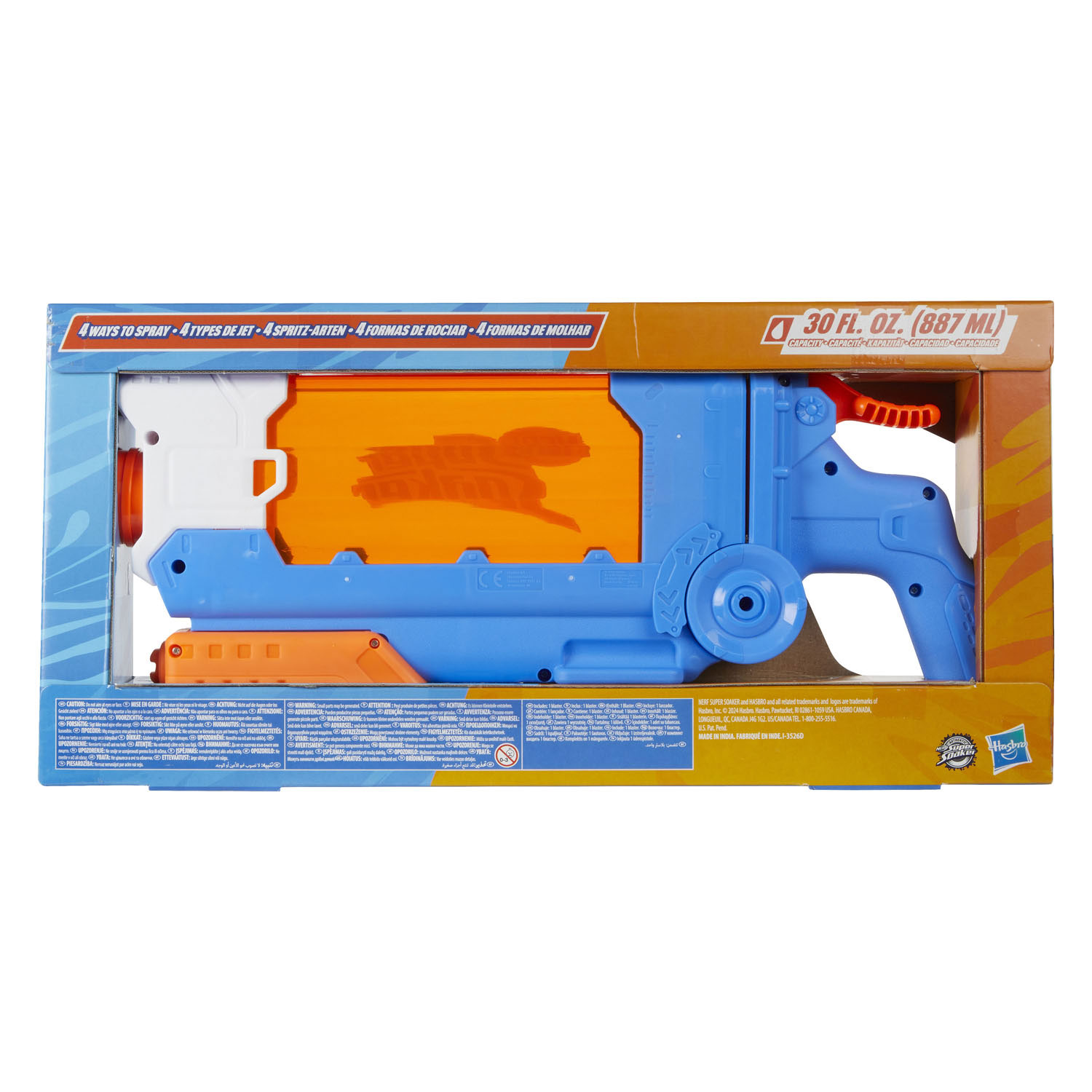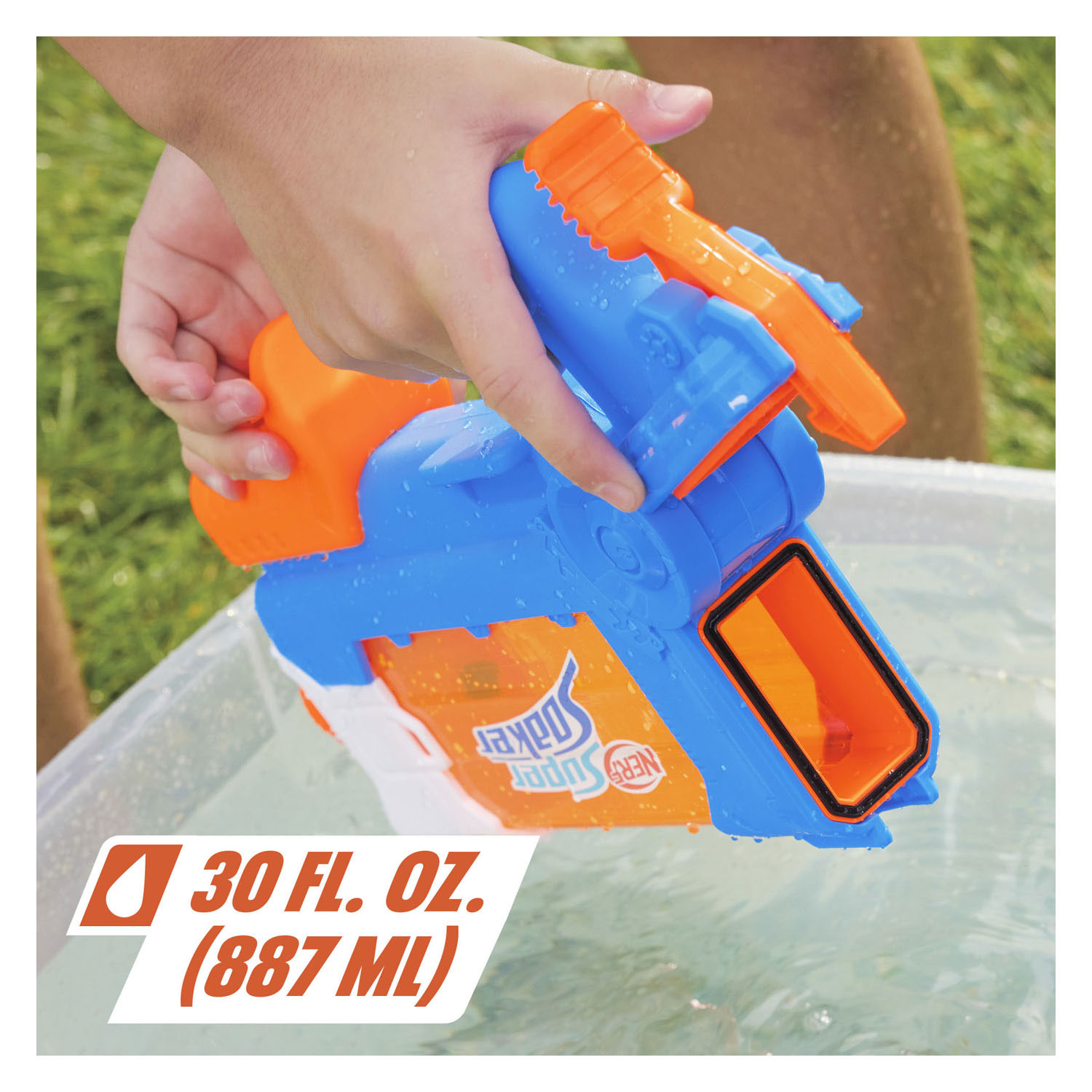 Der Nerf Super Soaker Flip Fill Wasserblaster bietet 4 verschiedene Wasserstrahlen, damit du deine Freunde und Familie beim Wasserspaß im Freien so richtig nassspritzen kannst! Einfach die Düse umklappen: Für einen schmalen Strahl, einen breiten Strahl, einen Fächerstrahl oder einen schrägen Fächerstrahl einfach umdrehen. Zielen und den Schieber vor- und zurückbewegen – und schon kann der Wasserspaß losgehen! Dank des Schnellfüllsystems ist der Blaster im Handumdrehen einsatzbereit! Der Wassertank fasst bis zu 887 ml (32 oz). Der Nerf Super Soaker ist das perfekte Spielzeug für Kinder und ein tolles Geschenk für actionreichen Wasserspaß im Freien! Nerf Super Soaker und alle zugehörigen Merkmale sind Marken von Hasbro.