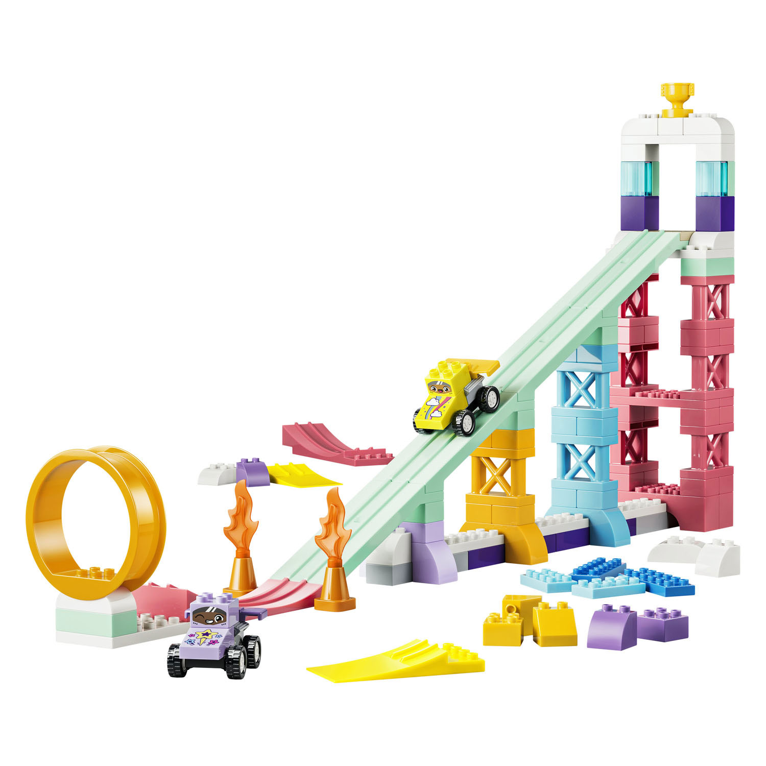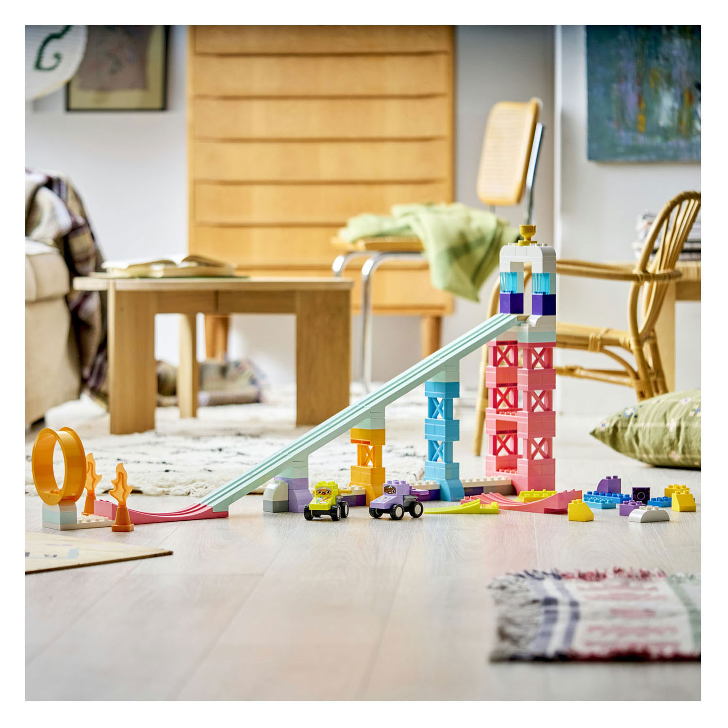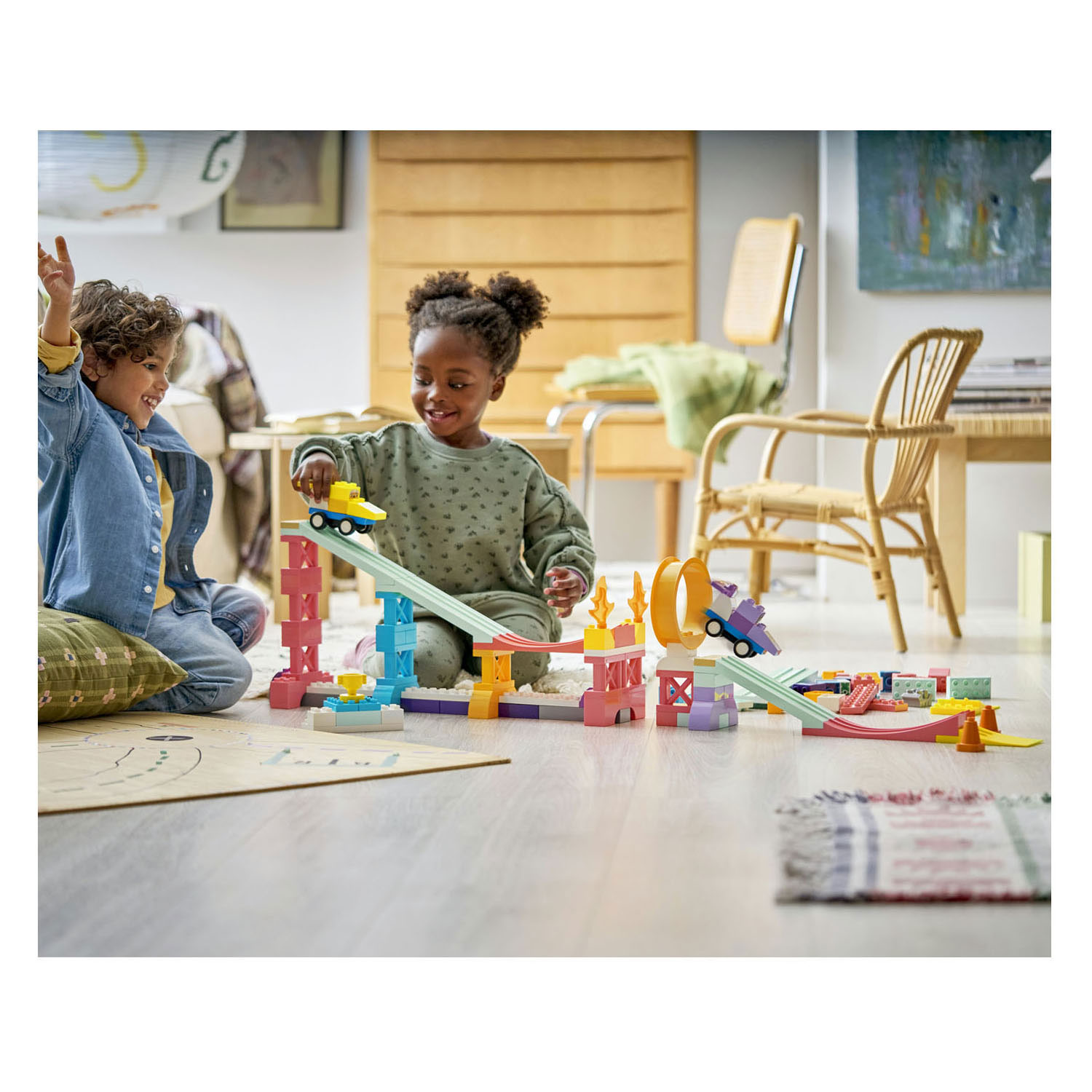 Mit dem LEGO® DUPLO® City 3-in-1 Kreativ-Rampen-Set mit Fahrzeugen (10478) sind stundenlanger Spielspaß garantiert! Dieses Set ermöglicht es Kindern, mit zwei Rennwagen und Bausteinen drei verschiedene Rampen zu bauen und dabei spielerisch zu lernen. Modell A ist eine lange, hohe Rampe mit Sprungschanze. Modell B besteht aus zwei kürzeren Rampen, auf denen Kinder die Farben üben, indem sie das passende Fahrzeug zuordnen, bevor sie gegen Familie und Freunde antreten. Mit Modell C lernen kleine Rennfahrer, Probleme zu lösen, indem sie die Autos durch den Looping und über die Schlucht springen lassen. Dabei entwickeln sie auch ihre emotionale Intelligenz und Ausdauer. Das Set enthält verschiedene Zubehörteile wie Flammen, Verkehrskegel und einen Pokal, um die Spannung eines Rennens nachzuspielen. Mit lustigen Szenarien, realistischen Details und Lernmomenten helfen die LEGO® DUPLO® City Lernspielzeuge Kindern, die Welt um sich herum zu verstehen. Das Set enthält 111 Teile. PÄDAGOGISCHES AUTOSPIELZEUG – Dieses 3-in-1-Rennbahn-Set mit Rampen und Fahrzeugen (10478) bietet stundenlangen kreativen Stunt-Spaß und fördert verschiedene Fähigkeiten. 3-IN-1-BAUSET – Mit 111 Steinen und Teilen zum Bauen von 3 verschiedenen Rampen, 2 Rennwagen und jeder Menge Zubehör wie Flammen, Verkehrskegeln und einem Pokal ist für stundenlangen Spielspaß für Kleinkinder gesorgt. ALLEIN ODER ZUSAMMEN RENNEN – Kleine Autofans können eine lange Rampe mit Sprungschanze, eine geteilte Rampe mit einer Lücke zum Überspringen oder 2 kurze Rampen bauen, um gegen Familie oder Freunde anzutreten. PÄDAGOGISCHES SPIELZEUG – Dieses Set bietet zahlreiche Lernmöglichkeiten und hilft Kleinkindern, ihr räumliches Vorstellungsvermögen, ihre Problemlösungsfähigkeiten und ihre Farberkennung zu entwickeln sowie Durchhaltevermögen und den Umgang mit Emotionen zu lernen. GESCHENKIDEE FÜR KLEINKINDER – Dieses Rennbahn-Set ist eine tolle Geschenkidee für Jungen und Mädchen ab 3 Jahren, die Autospielzeug und Rennsets lieben. SICHERES SPIELEN – Die Teile dieses farbenfrohen Sets wurden umfassend getestet, um sicherzustellen, dass sie strenge Kindersicherheitsstandards erfüllen. SPASS UND LERNEND FÜR DIE KLEINEN – LEGO® DUPLO® Sets wurden entwickelt, um Kleinkinder bei der Entwicklung grundlegender Fähigkeiten zu unterstützen und ihnen gleichzeitig spannende Bauaktivitäten zu ermöglichen. ABMESSUNGEN – Die höchste Rampe dieses 111-teiligen LEGO® Sets ist ca. 48 cm hoch, 99 cm breit und 12 cm tief.