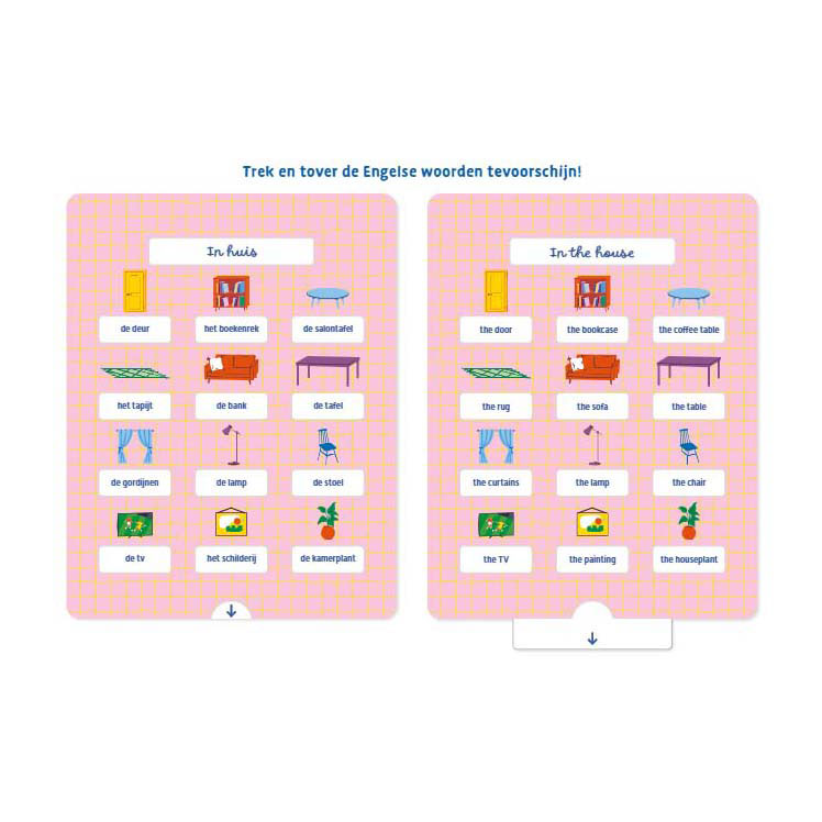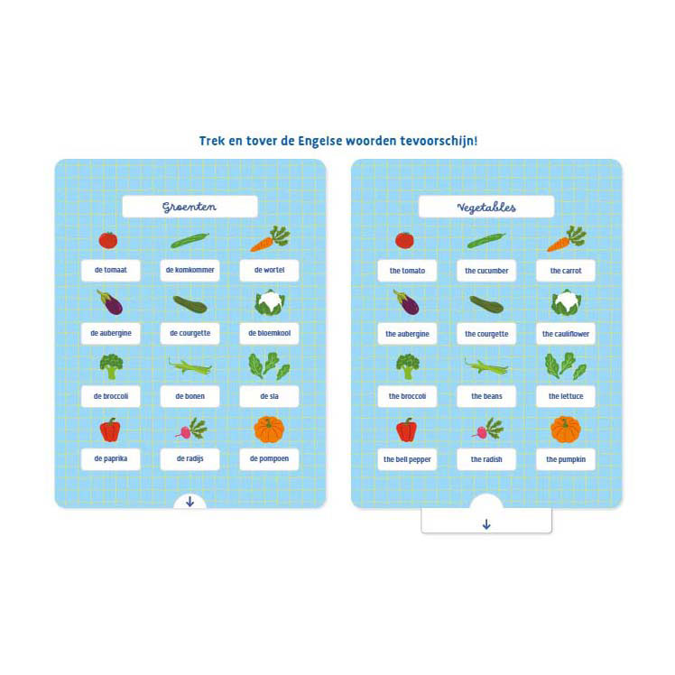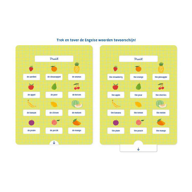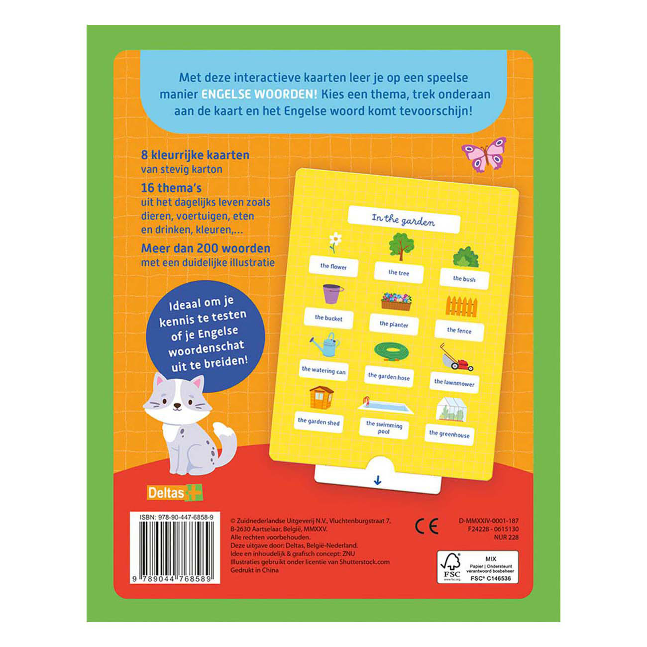 Möchten Sie Ihren englischen Wortschatz auf spielerische Weise auffrischen oder erweitern? Dann ist diese interaktive Kartenbox genau das Richtige für Sie! Die Box enthält 8 farbenfrohe Karten aus stabilem Karton mit vielen Zeichnungen und niederländischen Wörtern. Jede Karte präsentiert Wörter zu einem Thema aus dem Alltag. Wählen Sie ein Thema, ziehen Sie an der Unterseite der Karte, und schon erscheinen die englischen Wörter! Ideal zum Üben einfacher Wörter! Inhalt: • 1 ansprechend gestaltete Aufbewahrungsbox • 8 farbenfrohe Karten aus stabilem Karton • 16 Themen aus dem Alltag wie Tiere, Fahrzeuge, Essen und Trinken sowie Farben • Über 200 Wörter mit anschaulichen Illustrationen