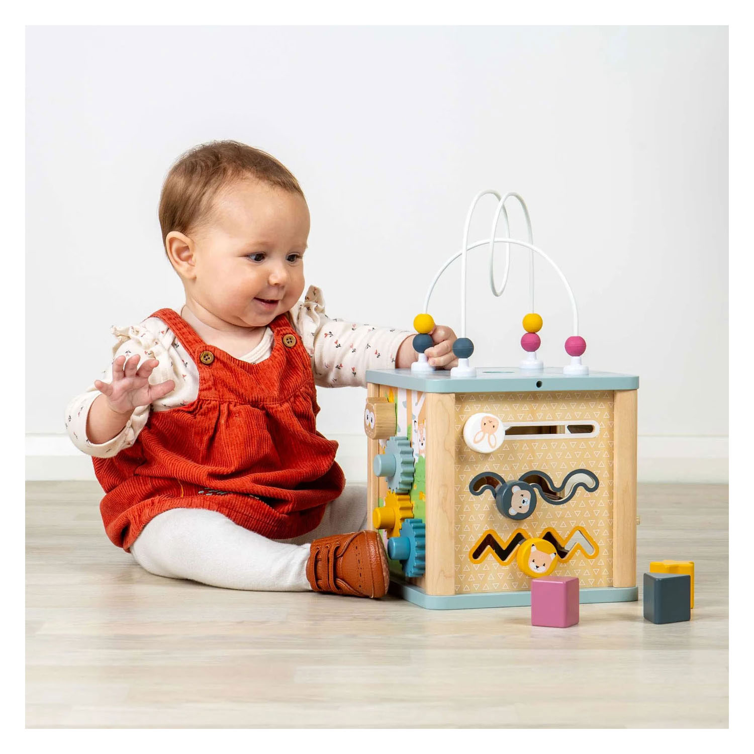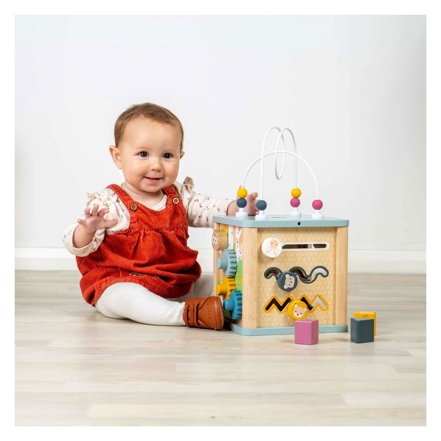 Mit dem Bigjigs Aktivitätswürfel entdecken Kleinkinder immer wieder Neues. Dieser Holzwürfel bietet auf allen Seiten verschiedene Spielelemente wie eine Perlenspirale, drehbare Zahnräder und verschiebbare Figuren. So sind kleine Hände spielerisch beschäftigt und lernen gleichzeitig Neues. Jede Seite bietet eine andere Aktivität zum Drehen, Schieben oder Sortieren. Kinder trainieren ihre Feinmotorik, lernen Formen zu erkennen und entdecken, wie sich die verschiedenen Teile bewegen. Der Würfel ist aus robustem Holz gefertigt, hat sanfte Farben und abgerundete Kanten und sorgt so für sicheres Spielen. Eigenschaften : • Bigjigs Aktivitätswürfel • Maße: ca. 21,9 x 35,9 x 20,8 cm • Gewicht: ca. 1,4 kg • Geeignet ab 12 Monaten • Hergestellt aus hochwertigen, verantwortungsvoll produzierten Materialien • Entspricht den aktuellen europäischen Sicherheitsstandards