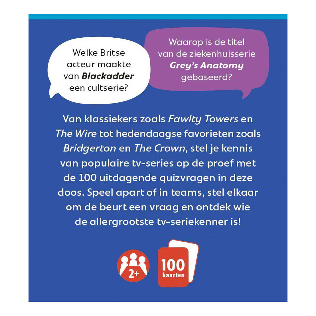 Welcher britische Schauspieler machte Blackadder zur Kultserie? Was ist die Inspiration für den Titel der Krankenhausserie Grey's Anatomy? Von Klassikern wie Fawlty Towers und The Wire bis hin zu modernen Favoriten wie Bridgerton und The Crown – testen Sie Ihr Wissen über beliebte Fernsehserien mit den 100 kniffligen Quizkarten in dieser Box. Welcher britische Schauspieler machte Blackadder zur Kultserie? Und was ist die Inspiration für den Titel der Krankenhausserie Grey's Anatomy? Spielen Sie allein oder im Team, stellen Sie sich abwechselnd Fragen und finden Sie heraus, wer der größte Serienexperte ist! Eigenschaften: • Schöne, stabile Box mit je 100 Karten • Ein ideales Geschenk für alle, die behaupten, alles über Fernsehserien zu wissen • Präsentiert in einem kompakten Tischdisplay