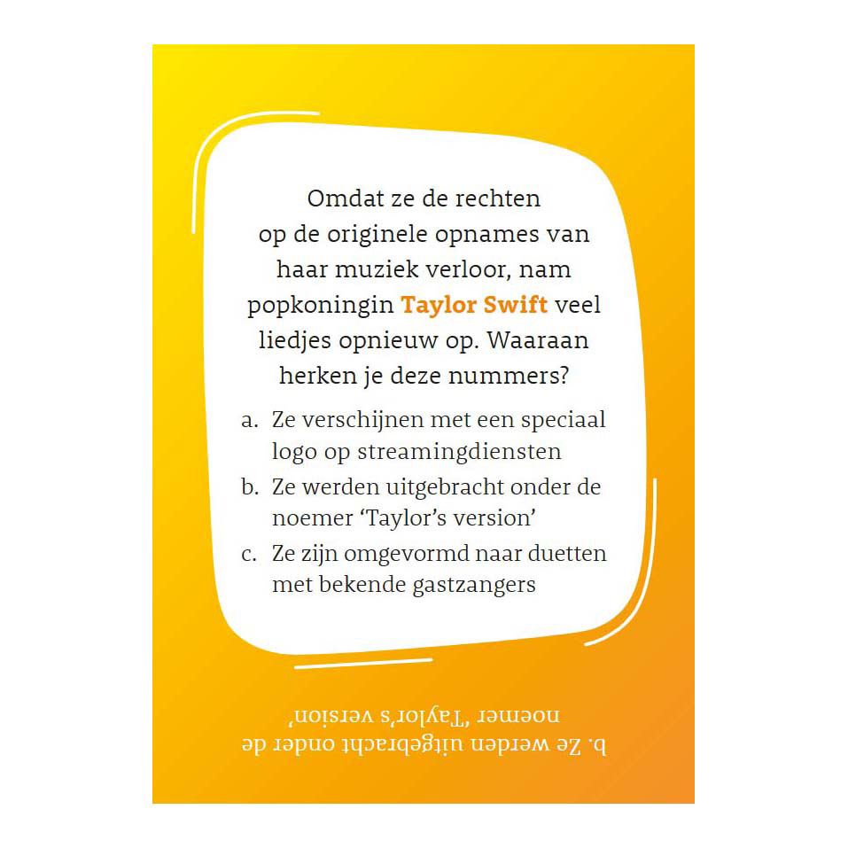 Wie heißt die Boyband, mit der Justin Timberlake seine Karriere startete? Wie lautet der Nachname der Brüder Noel und Liam von der britischen Band Oasis? Von Musiklegenden wie Queen und Whitney Houston bis hin zu aktuellen Top-50-Hits wie George Ezra und Taylor Swift – teste dein Popmusikwissen mit den 100 kniffligen Quizkarten in dieser Box! Wie heißt die Boyband, mit der Justin Timberlake seine Karriere startete? Und wie lautet nochmal der Nachname der Brüder Noel und Liam von der britischen Band Oasis? Spiele allein oder im Team, stellt euch abwechselnd Fragen und findet heraus, wer der größte Popmusik-Experte ist! Eigenschaften : • Schöne, stabile Box mit je 100 Karten • Ein ideales Geschenk für alle, die behaupten, alles über Popmusik zu wissen • Präsentiert in einem kompakten Tischdisplay