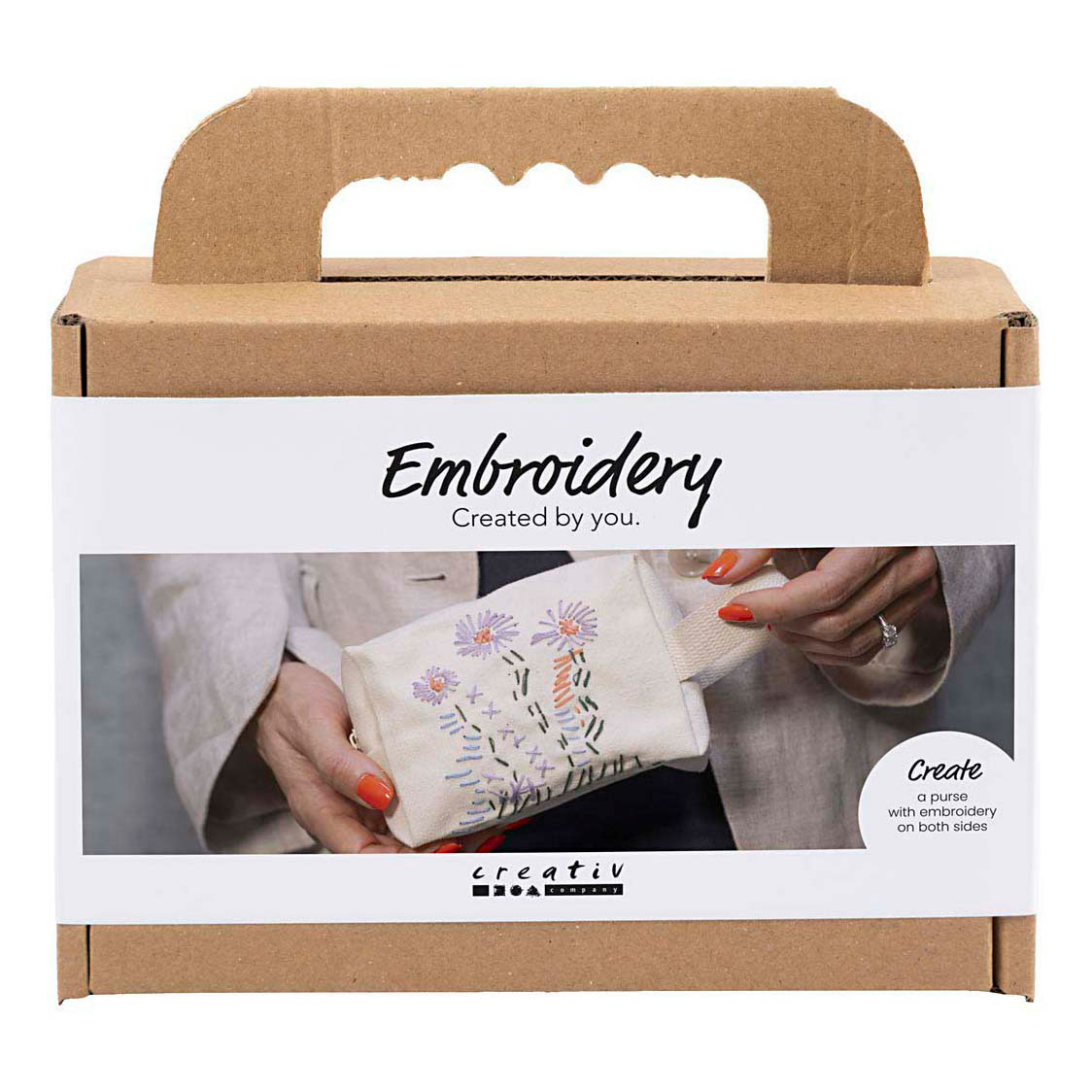 Mit unserem Kreativset können Sie eine Kosmetiktasche mit wunderschönen Blumenstickereien verzieren. Das Set enthält alle benötigten Materialien und Anleitungen.