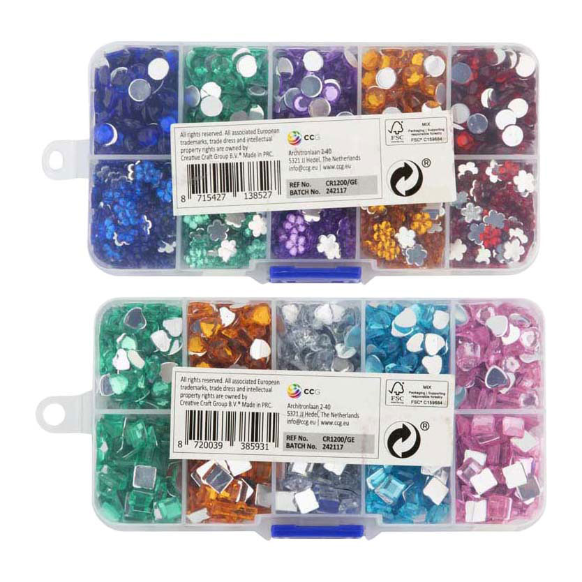 Edelsteine ​​in verschiedenen Farben und Formen in einer praktischen 55-Gramm-Aufbewahrungsbox. Ideal zum Dekorieren von Bastelarbeiten. Geeignet für Kinder ab 3 Jahren.