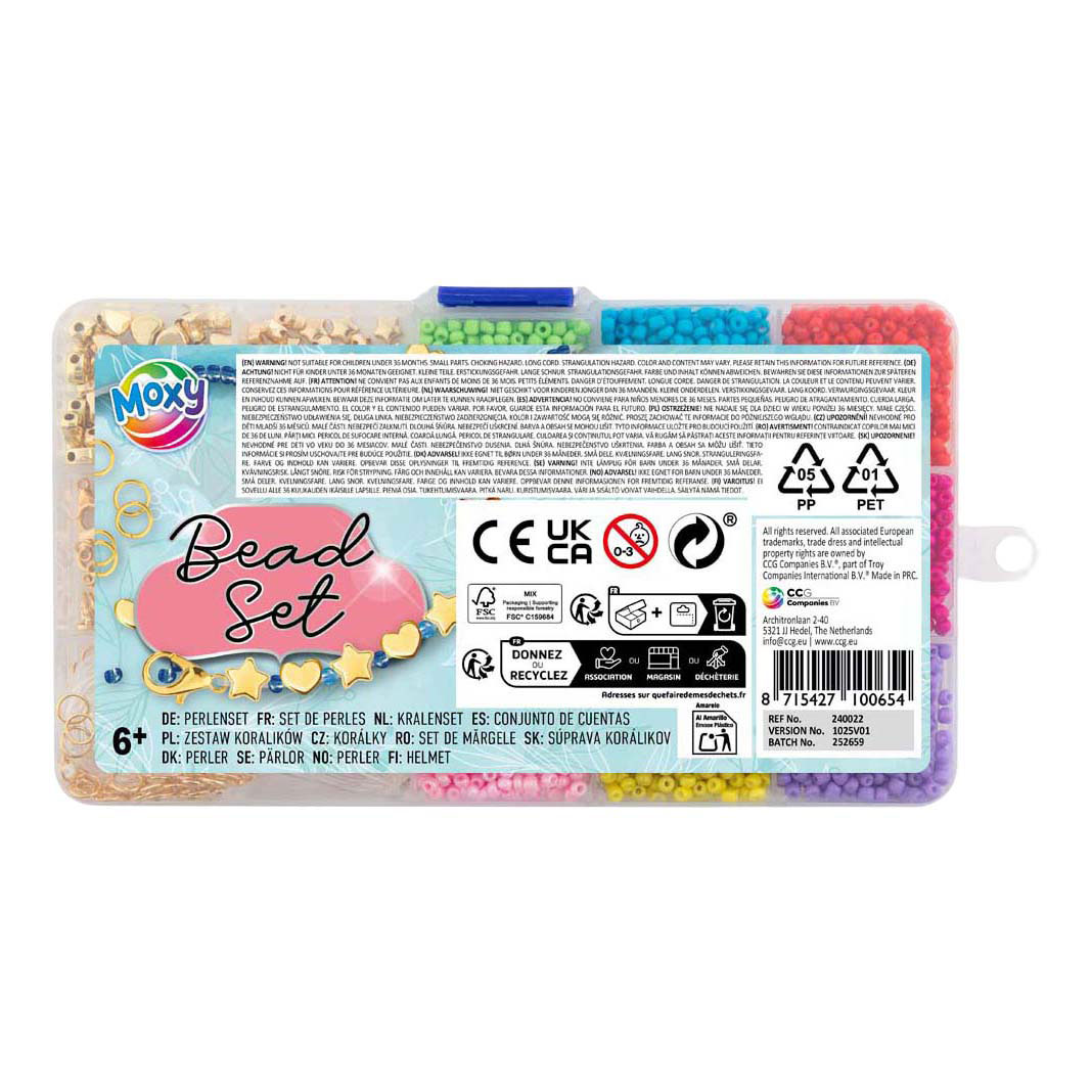 Wiederverschließbare Aufbewahrungsbox mit 9 farbigen Perlen, Buchstabenperlen, Muscheln, Engelsanhängern und Gummiband. Kreiere wunderschöne Armbänder, Halsketten und anderen Schmuck! Die Box ist 10 x 17 cm groß. Geeignet für Kinder ab 6 Jahren.