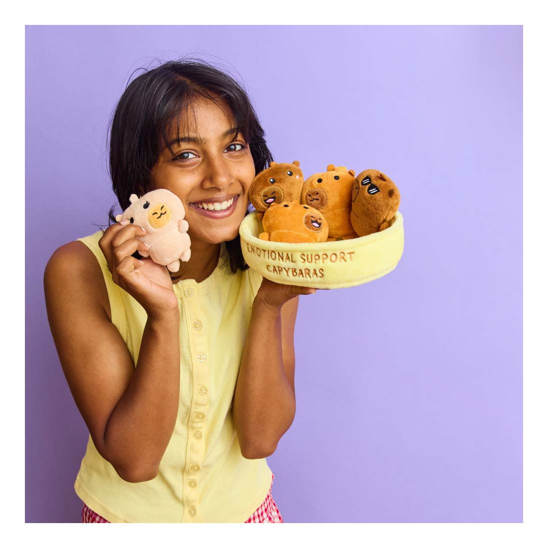 Tierische Unterstützung: Ein Korb voller entspannter Kuschelfreunde! Lernen Sie die emotionalen Unterstützungs-Capybaras kennen! Dieses fröhliche Plüschtier-Set bringt die entspanntesten und faszinierendsten kleinen Tiere direkt in Ihr Zimmer. Diese fünf weichen Plüsch-Capybaras sind die besten Freunde zum Spielen, Chillen und Kuscheln. Jedes Capybara hat seinen eigenen lustigen Charakter. Egal, ob Sie glücklich, etwas traurig oder einfach nur zum Spielen sind: Es gibt immer ein weiches, entspanntes Capybara, das zu Ihrer Stimmung passt! Die Capybaras sitzen gemütlich zusammen in ihrem eigenen Plüschkorb, sodass Sie sie überallhin mitnehmen können. Diese kleinen Freunde sind nicht nur wunderbar zum Kuscheln, sondern sehen auch als trendige Dekoration auf Ihrem Bett, Sofa oder Schreibtisch super süß aus. Die emotionalen Unterstützungs-Capybaras sind mehr als nur ein Sammlerstück. Sie wurden entworfen, um Trost zu spenden, zu unterhalten und Sie daran zu erinnern, dass ein bisschen Zen das Leben viel schöner macht. Perfekt als Geschenk, als originelle Selbstfürsorge oder als süße Ergänzung Ihrer Sammlung. Erweitere deine Sammlung der „Emotionalen Unterstützung“! Neben diesen entspannten Wasserschweinen gibt es auch Nuggets, Pommes und Sushi. Sammle alle Plüschtiere der „Emotionalen Unterstützung“ und stelle deine eigene unwiderstehliche Crew zusammen! Inhalt: 1 Plüschkorb und 5 Plüsch-Wasserschweine mit lustigen Gesichtern.