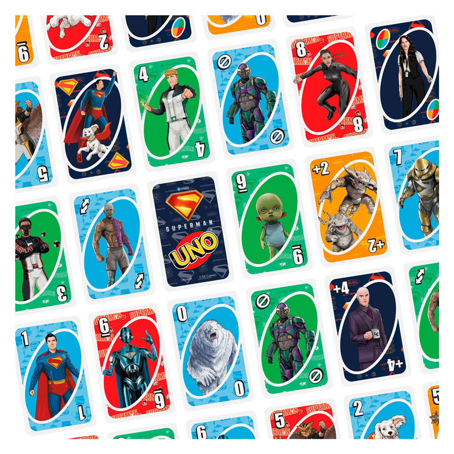 Superman-Fans werden dieses UNO-Kartenspiel lieben! Die Karten zeigen Bilder beliebter Charaktere und Szenen aus dem Film. Die Spieler legen Karten mit Farben und Zahlen zu. Es gibt sogar eine spezielle „Kryptonit“-Regel: Ein Spieler darf alle grünen Karten der anderen nehmen! Und nicht vergessen: „UNO!“ rufen, wenn man nur noch eine Karte hat! Ein tolles Geschenk für Superman-Fans und Kartenspielbegeisterte ab 7 Jahren. Farben und Dekorationen können variieren.