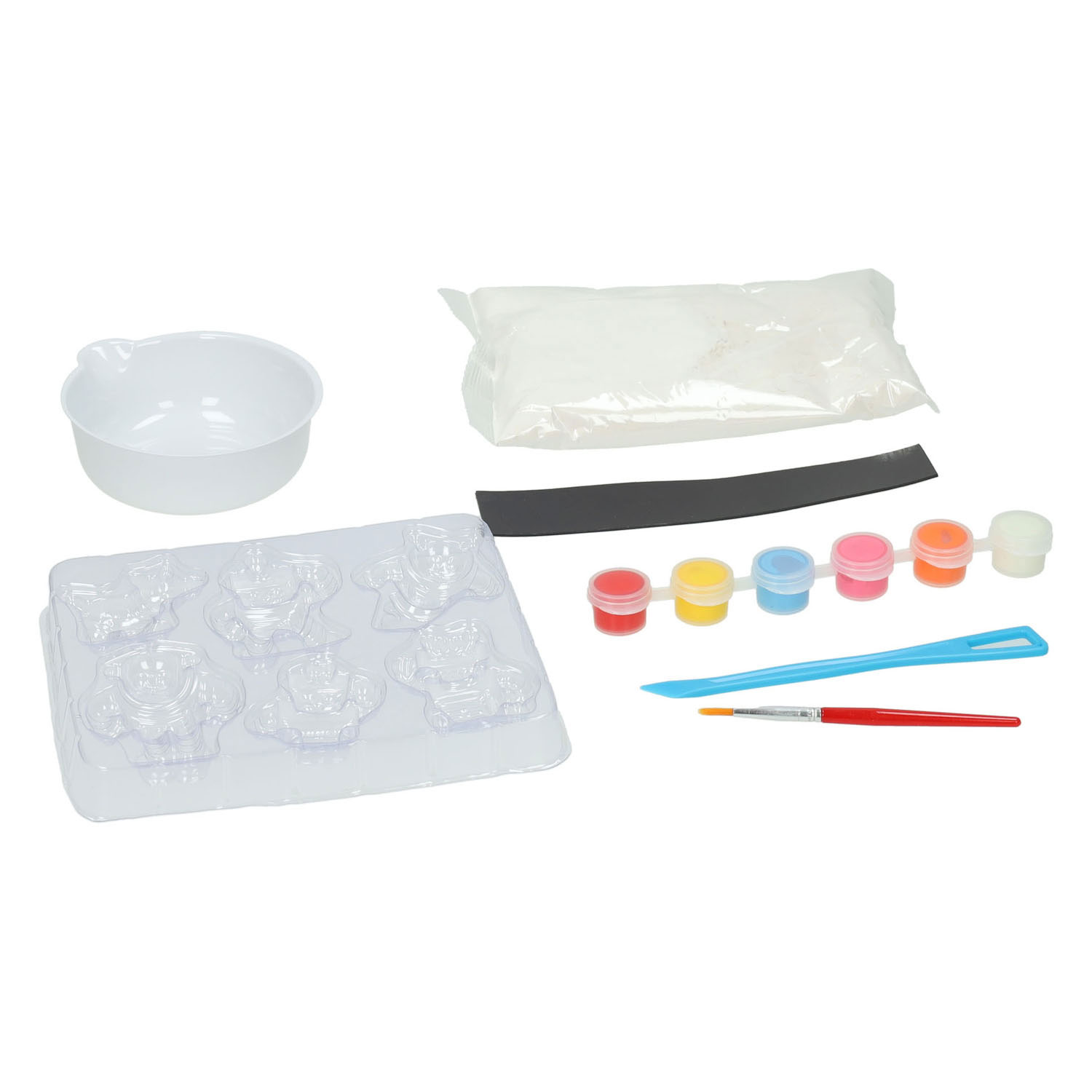 Gipsabdruck-Bastelset zum Bauen von 6 Robotern mit Leuchteffekt. Inhalt: Form für 6 Roboter, ein Beutel Gipspulver, eine Mischschale, 5 Farben und ein Glas Leuchtfarbe, ein Magnetstreifen, ein Spachtel und ein Pinsel. Geeignet für Kinder ab 5 Jahren.