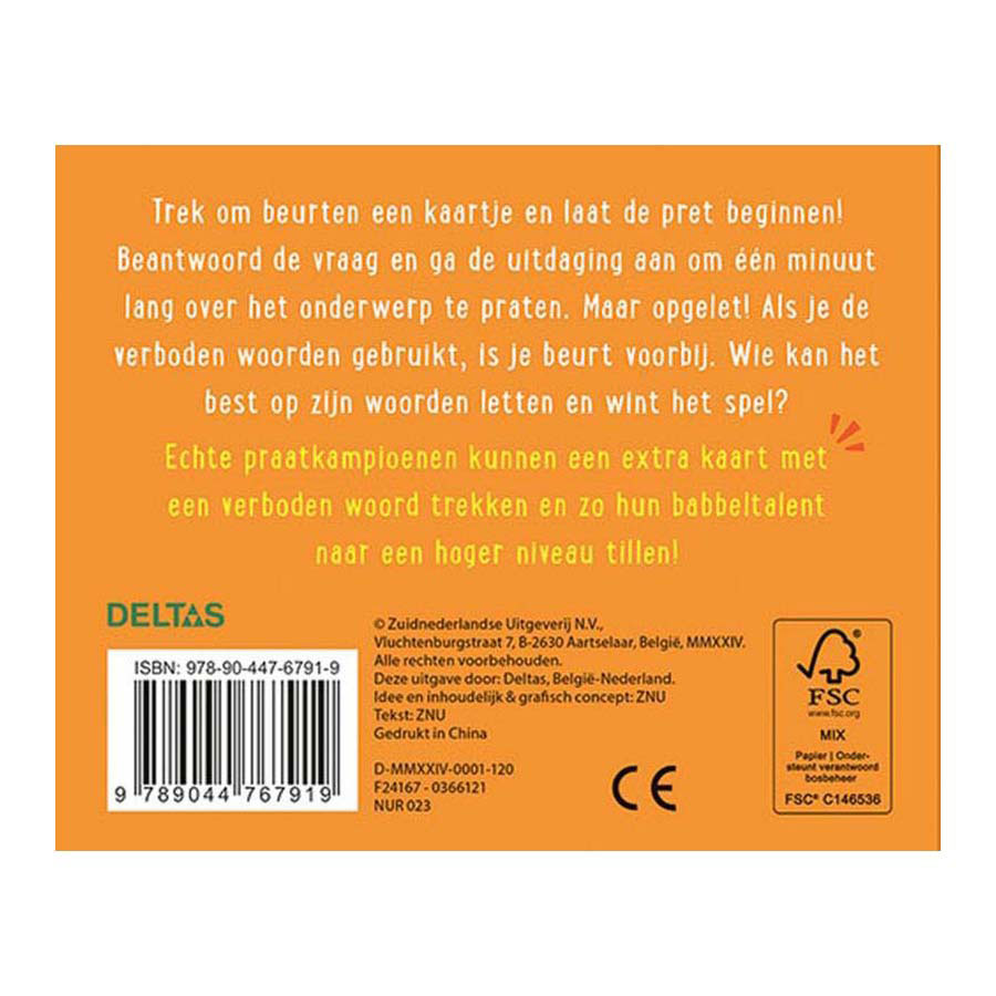 Ein urkomisches Sprechspiel von Deltas für Jung und Alt! Die Spielregeln sind sehr einfach! Ziehen Sie abwechselnd eine Karte und stellen Sie sich der Herausforderung, eine Minute lang über das Thema auf der Karte zu sprechen. Aber seien Sie vorsichtig! Es gibt auch verbotene Wörter und wenn Sie sie verwenden, ist Ihr Zug beendet. Möchten Sie das Spiel auf die nächste Stufe bringen? Fügen Sie dem Spiel dann die zusätzlichen Karten mit verbotenen Wörtern hinzu, um es noch anspruchsvoller zu machen. Wenn Sie an der Reihe sind, zeichnen Sie ein zusätzliches verbotenes Wort und zeigen Sie, dass Sie ein echter Redner-Champion sind! Wer kann seine Worte am besten beobachten und das Spiel gewinnen? - Ideal für Familien- und Kinderfeste - Keine Vorbereitung erforderlich! - Schachtel mit 50 Karten
