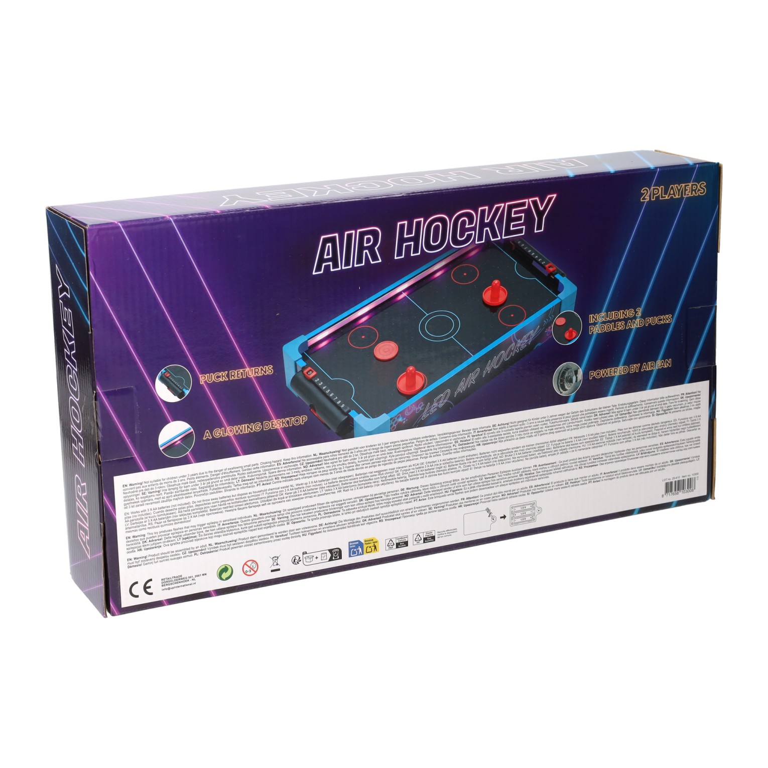 Tisch-Airhockeyspiel mit LED-Beleuchtung und integriertem Ventilator. Inklusive 2 Pucks und 2 Schlägern. Maße: ca. 41 x 8 x 22 cm. Geeignet für 2 Spieler.