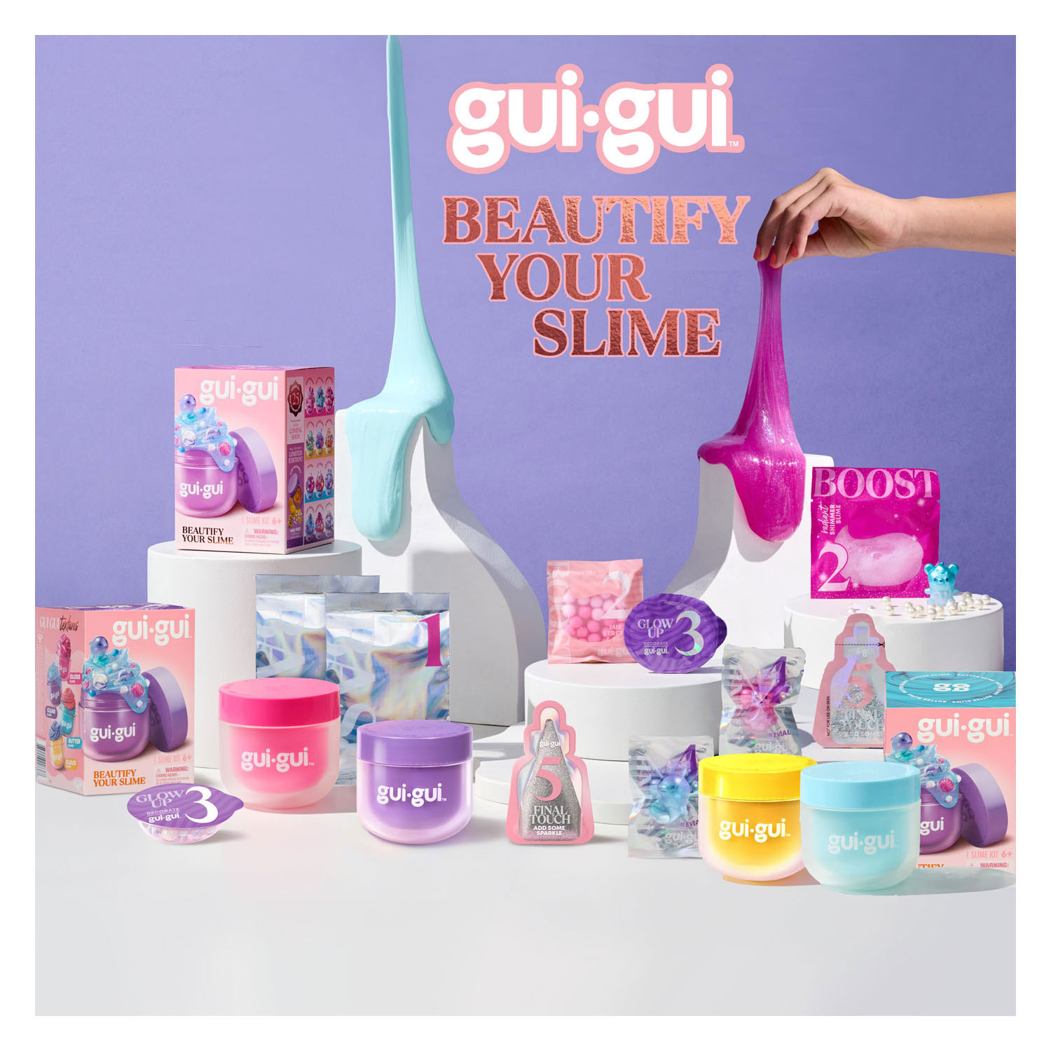 Entdecke die neue TikTok-Sensation: Gui Gui – der schönste und weichste Slime aller Zeiten, selbstgemacht! Verleihe deinem Slime ein glamouröses Glow-Up und lass ihn strahlen wie nie zuvor: Verschönere deinen Slime! Im Gui Gui Shimmer Deluxe Duo Pack findest du zwei schimmernde Slimes, einen Beutel mit Perlen und spezielle Glow-Up-Beutel für die ultimative Slime-Glamour-Session. Kreiere deinen eigenen Shimmer Slime und Crystal Pearl Slime! Packe dein Gui Gui aus und entdecke alles, was du für deinen eigenen funkelnden, duftenden Slime brauchst. Folge den 5 einfachen Schritten, um deinen perfekten Slime zu stylen: Finde deinen Duft-Slime, mische den Booster hinzu, verpasse ihm mit Charms einen tollen Glow, finde die Überraschungsfigur und füge Glitzer als i-Tüpfelchen hinzu. Zeig deinen Slime der Welt oder knete, ziehe und spiele nach Herzenslust damit! Bewahre deinen Slime im Glas auf, um später wieder damit zu spielen. Mit sage und schreibe 13 verschiedenen Gui-Gui-Schleimen zum Herstellen und Sammeln ist es immer eine Überraschung, welchen du bekommst. Probiere 4 einzigartige Texturen aus – Glänzend, Klar, Butter und Wolke – jede mit unwiderstehlichem Duft. Und wer weiß … vielleicht findest du ja den ultimativen Duftschleim: die limitierte Edition „Over the Rainbow“ von Gui Gui. Lass deinen Schleim mit Gui Gui erstrahlen! Altersempfehlung: ab 6 Jahren.