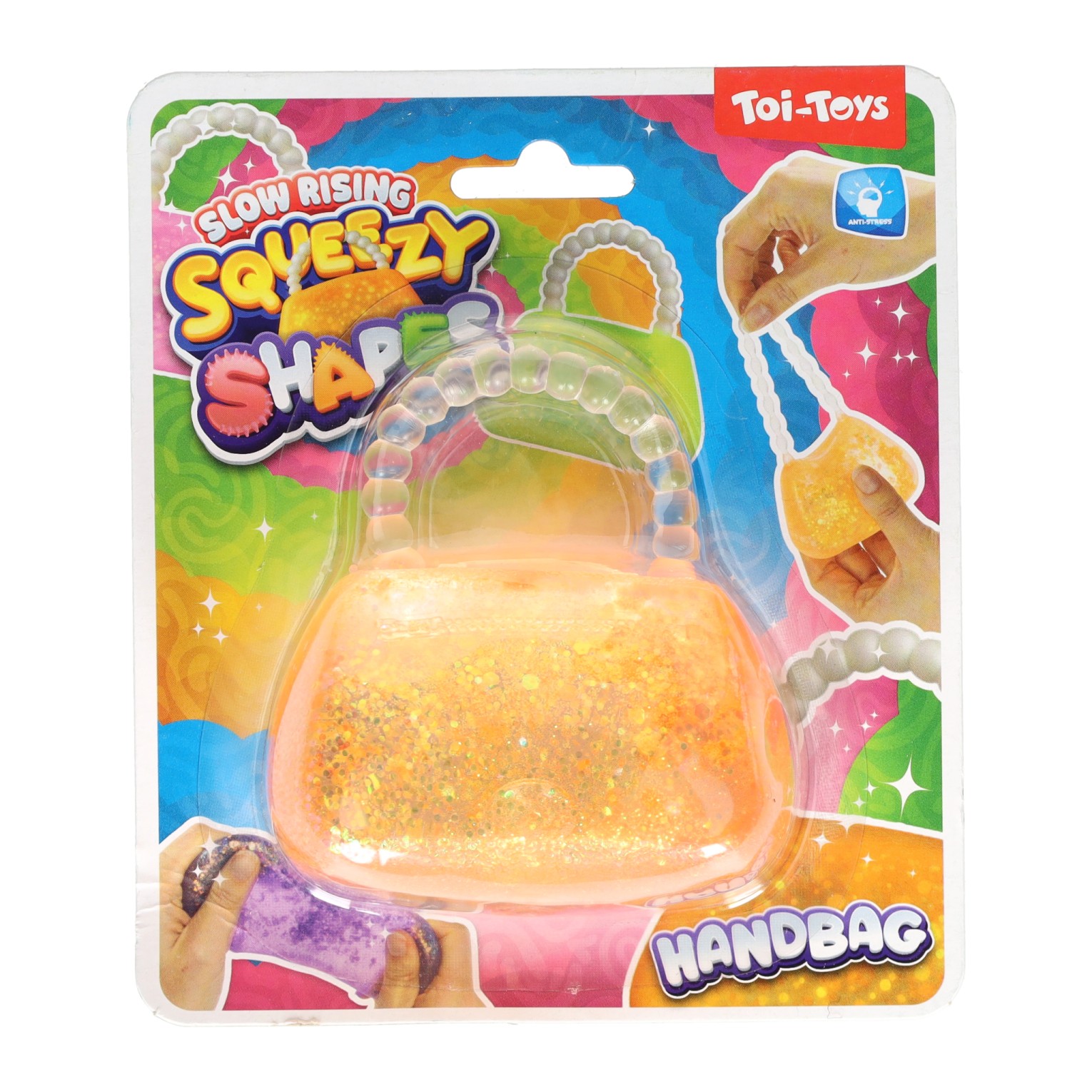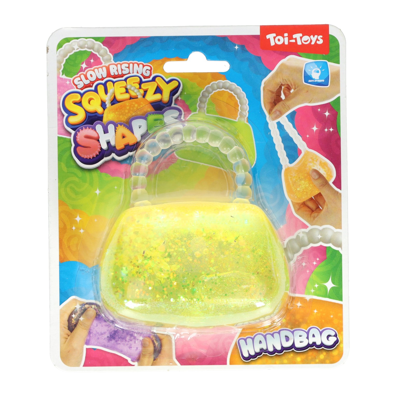 Diese 8 cm große Glitzer-Quetschhandtasche ist ein weiches Fidget-Toy, gefüllt mit Gel und Glitzer. Die Tasche ist aus Kunststoff gefertigt und hat einen Henkel mit Perlen. Geeignet für Kinder ab 3 Jahren und in verschiedenen Farben erhältlich.