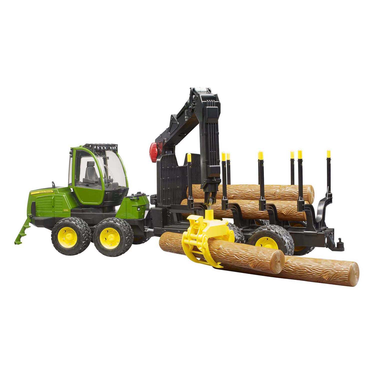 Aufgrund des weltweit stark steigenden Energieverbrauchs gewinnen erneuerbare Energiequellen rasant an Bedeutung. Holz aus der Forstwirtschaft ist eine der effizientesten verfügbaren Bioenergiequellen. Daher kann jeder junge Waldarbeiter stolz auf seinen Beitrag sein, wenn er mit den funktionalen BRUDER Fahrzeugen und Figuren typische Waldszenen nachstellt. Der vierachsige Rückewagen von John Deere kann gefällte Stämme durch unwegsames Gelände transportieren und ihre Ladung autonom verladen. Dafür nutzt er einen dreh- und schwenkbaren Ladekran mit automatisch schließendem Greifer. Die ohnehin schon hervorragenden Geländegängigkeiten des John Deere Rückewagens werden durch die vier Pendelachsen noch weiter verbessert. Dank der um 360° drehbaren Kabine behält der Fahrer (z. B. Art.-Nr. 60000 (nicht im Lieferumfang enthalten)) während der Fahrt und beim Beladen stets den Überblick. Der John Deere Forwarder ist das ideale Fahrzeug für stundenlangen Waldspaß.