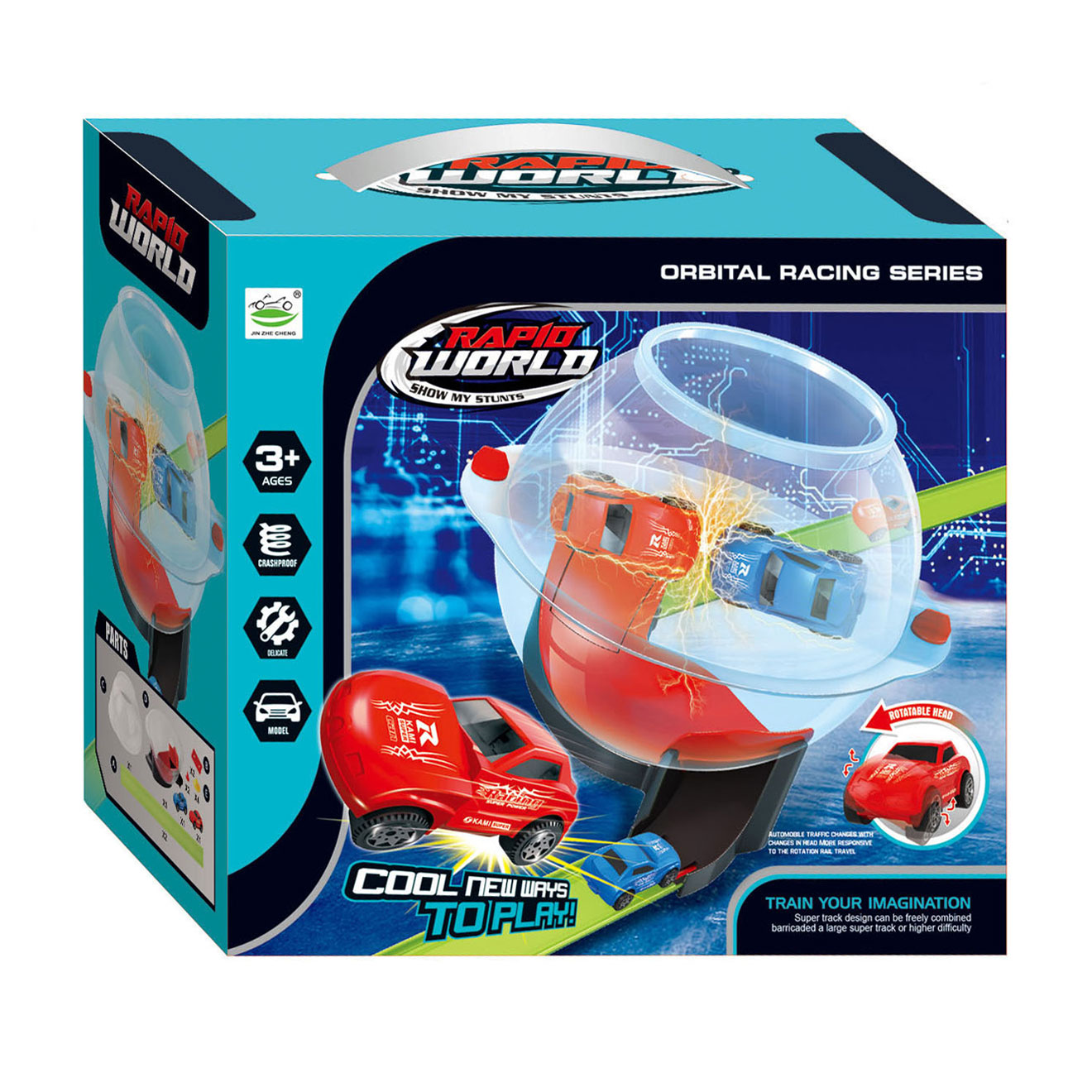 Fishbowl-Startset mit zwei Autos. Die Autos können in das Fishbowl geworfen werden. Dieses Set enthält das Fishbowl, zwei Autos, zwei Streckenabschnitte zum Anschließen an das Fishbowl und einige zusätzliche Teile zum Verbinden. Weitere Sets können zu einer größeren Rennstrecke verbunden werden. Das Set misst 100 x 20 x 27 Zentimeter und ist für Kinder ab 3 Jahren geeignet.