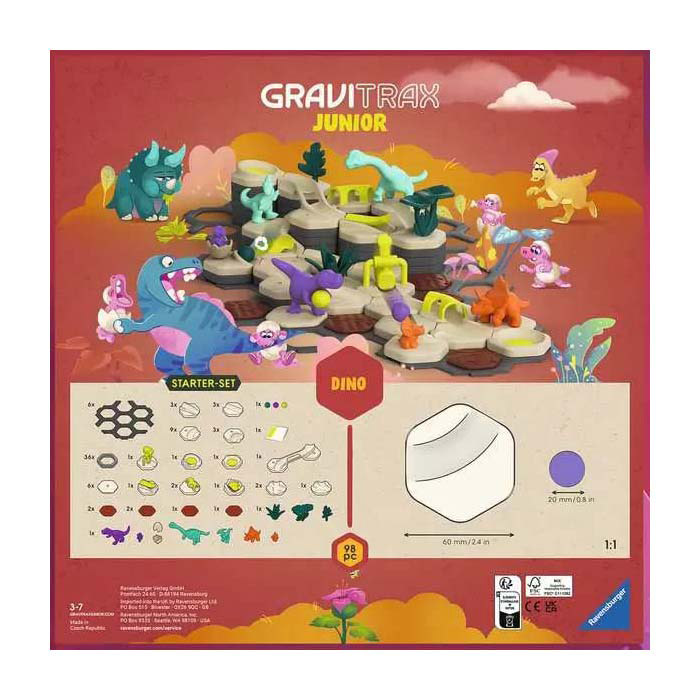 Mit der GraviTrax Junior Erweiterung Dino wird jede GraviTrax Junior Kugelbahn zu einer spektakulären Dinowelt. Die GraviTrax Junior Erweiterung Dino ist eine ideale Ergänzung zum Kugelbahnsystem. Kombiniert mit einem GraviTrax Junior Starterset können Kinder ab 3 Jahren sofort in die Welt der Dinosaurier eintauchen. Die verschiedenen Dinosaurierfiguren, der spektakuläre Vulkan und weitere Elemente aus der Dinosaurierwelt sorgen für grenzenlosen Bau- und Spielspaß. Alle Bauteile bestehen aus Holz-Biokunststoff. GraviTrax Junior ist ein interaktives Kugelbahnsystem für Jungen und Mädchen ab 3 Jahren: Mit GraviTrax Junior bauen Kinder nicht einfach nur einfache Kugelbahnen. Durch die individuelle Dekoration mit liebevoll gestalteten Elementen erschaffen Kinder ihre eigenen Themenwelten. GraviTrax Junior deckt altersgerechte Lerninhalte ab. Durch das freie Gestalten der Kugelbahnen werden Motorik und räumliches Denken gefördert. Durch das Erkunden des Rollverhaltens der Murmeln wird das Prinzip von Ursache und Wirkung hautnah erfahren. Das Spielen mit den (Tier-)Figuren und das Gestalten der Themenwelten regt das kreative Rollenspiel und die Fantasie der Kinder an. Dank verschiedener Erweiterungen können Kinder ihre Kugelbahnen immer wieder erweitern und neu gestalten – garantiert lang anhaltender Spielspaß.