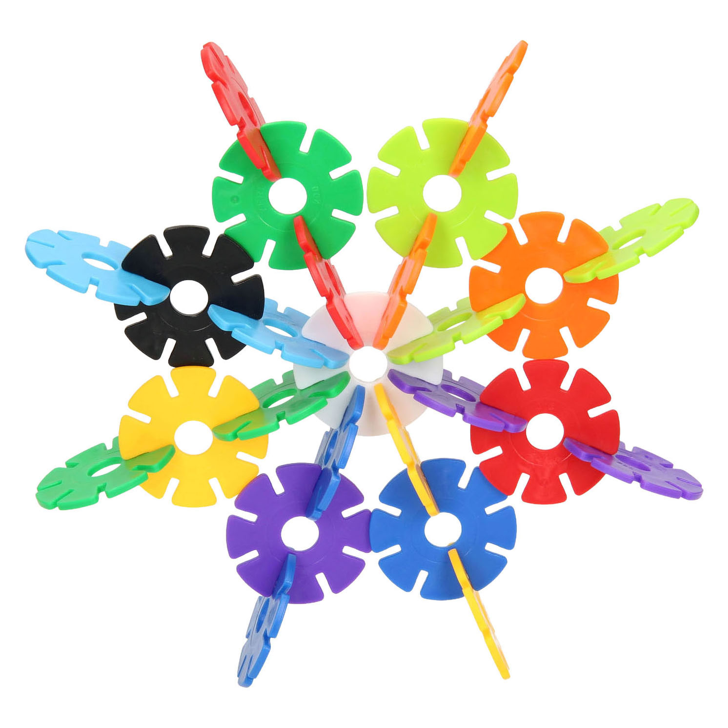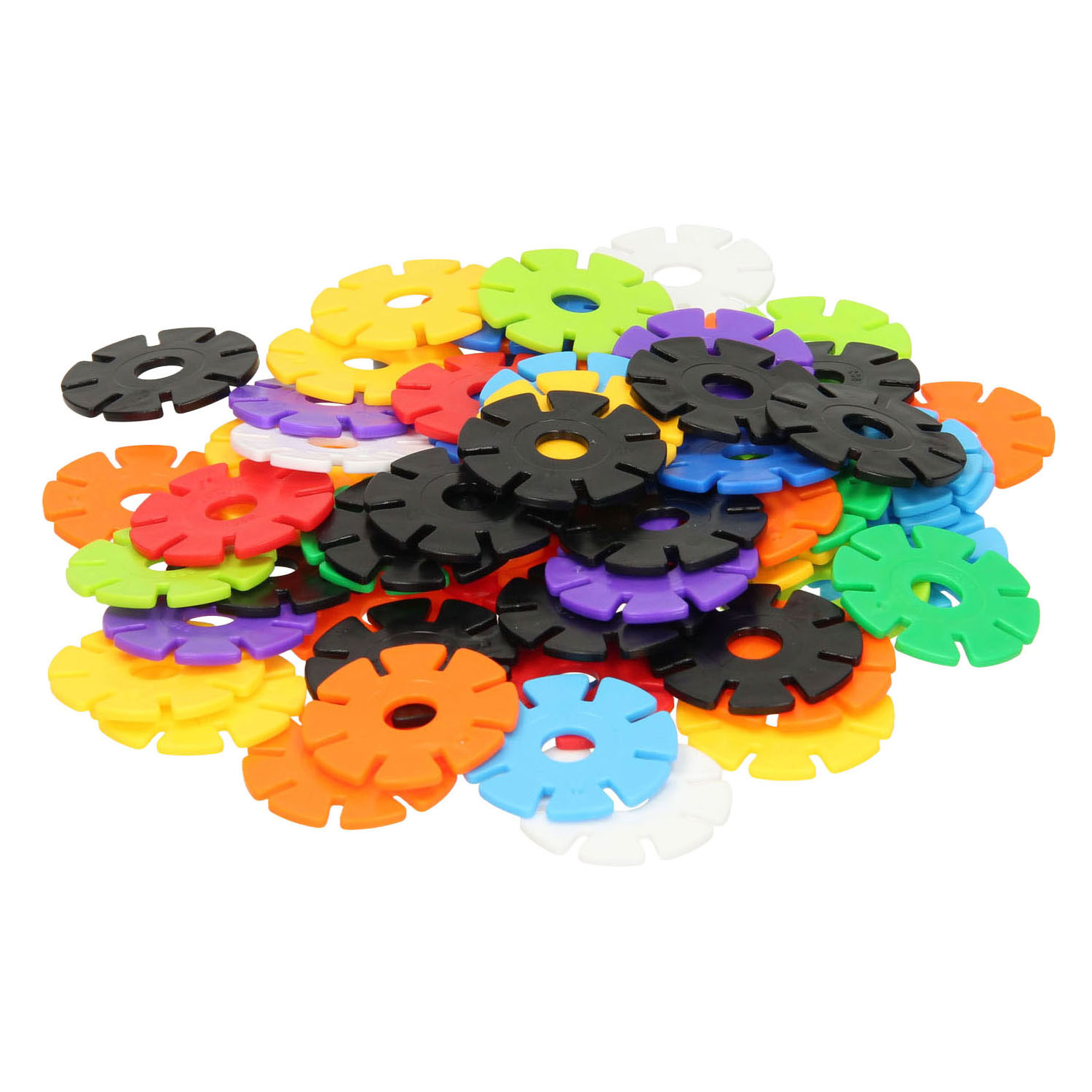 Set aus 340 Kunststoff-Bauscheiben (2,8cm) mit Kerben rundherum. Einschließlich Beispiele. Geeignet ab 3 Jahren.