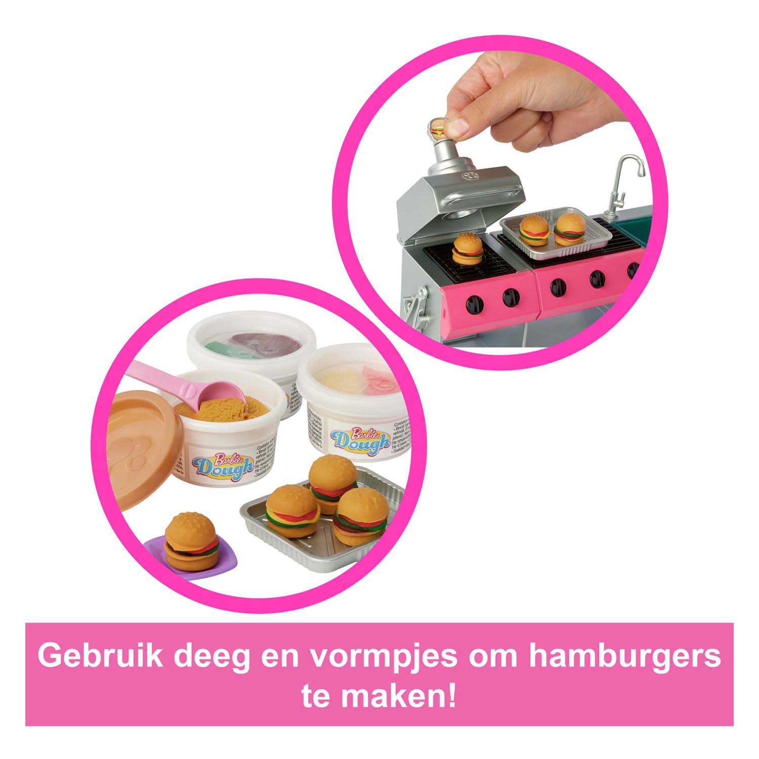 Adventure awaits just around the corner with the Barbie Dream Camper playset, featuring seven play areas and over 60 accessories to celebrate the great outdoors! Give the camper a push to hit the road, then unfold it at your destination to reveal a pop-up roof tent, living area, dining area, and restroom. There's so much to do -- fish in the pond, relax in the rocking chair, and create a cozy spot for the adorable puppy. When it's mealtime, use playdough to make hamburgers for Barbie and her friends (sold separately) and grill them on the barbecue -- watch as the food changes color as it cooks! With so many creative possibilities, the Barbie Dream Camper playset makes a fun-packed gift for kids ages 3 and up, especially those who love to play outside! Dolls not included. Colors and decorations may vary.