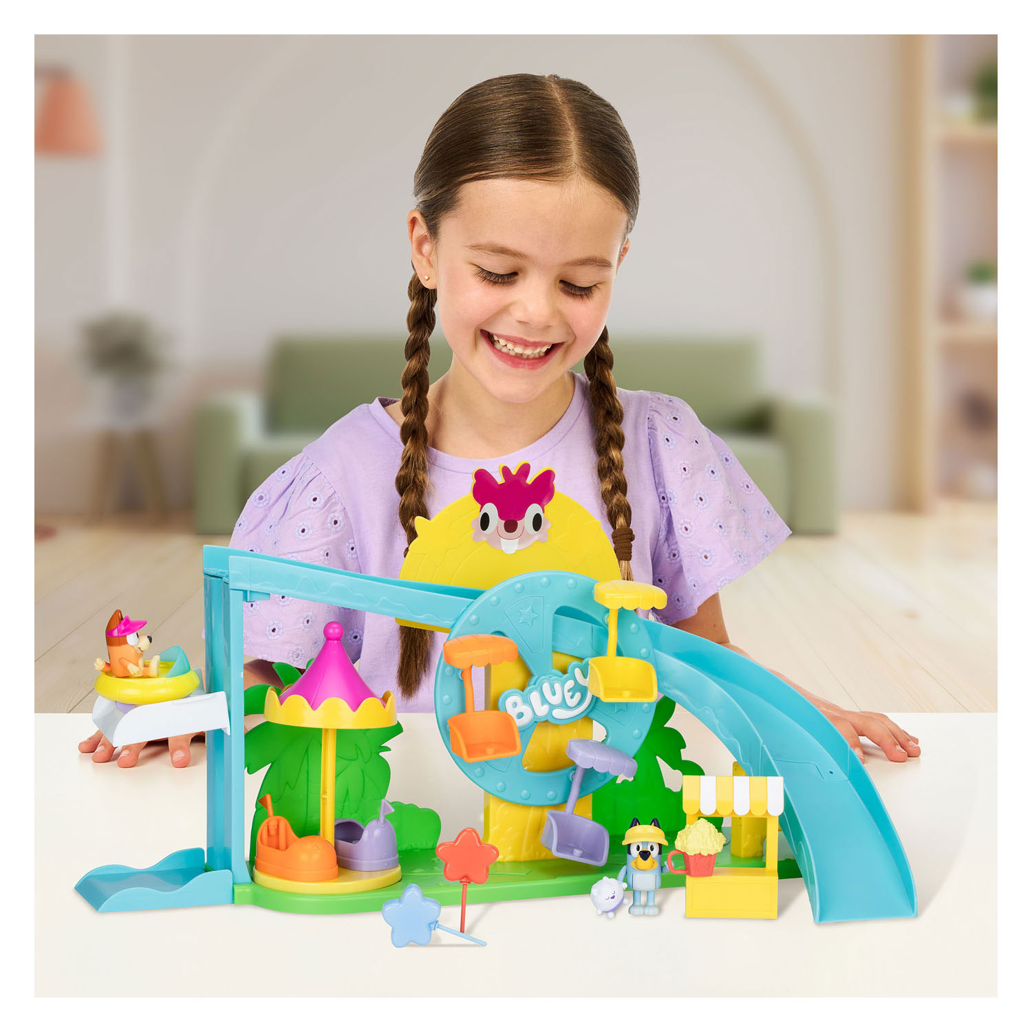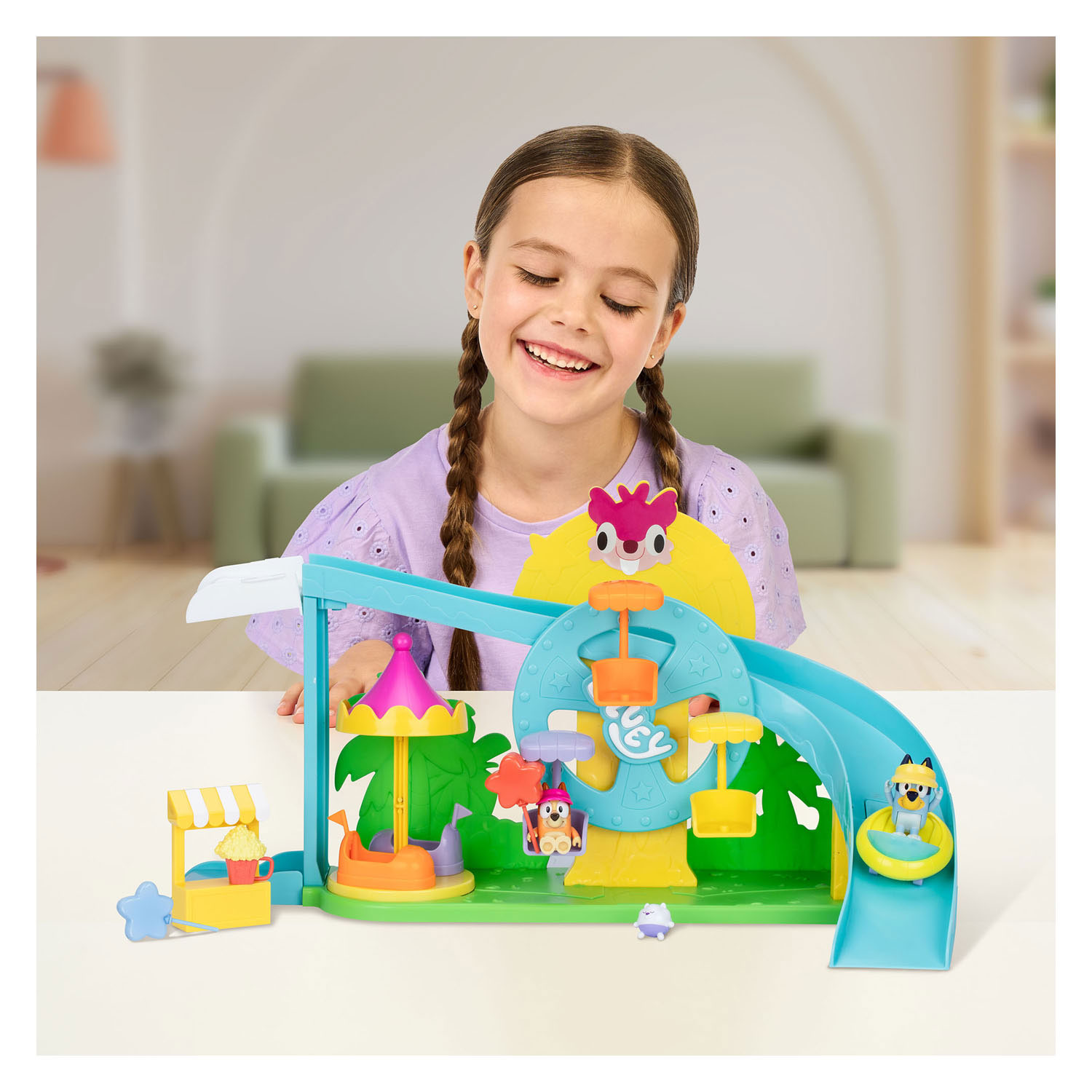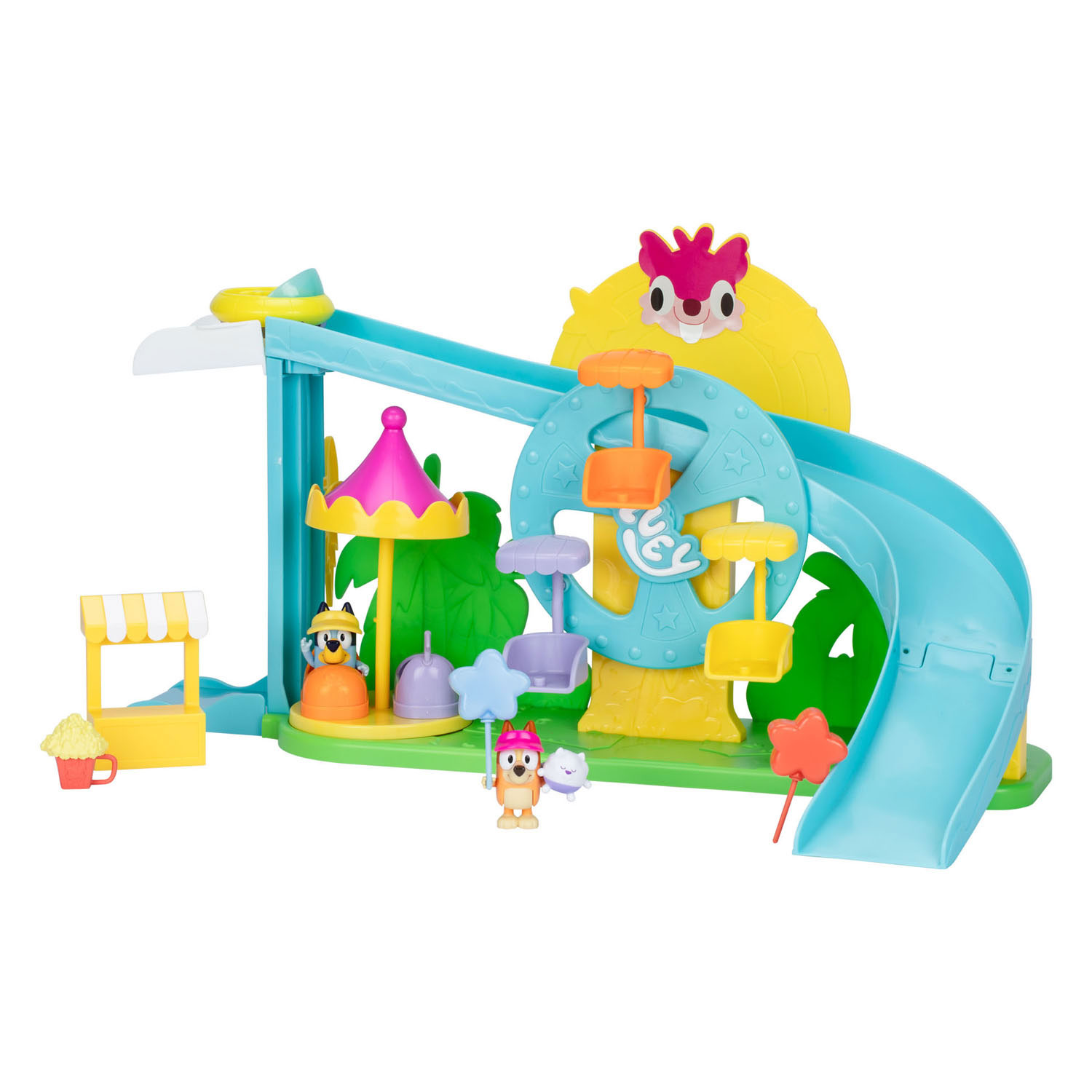 Experience the best day ever with Bluey and Bingo at Bluey's Ultimate Amusement Park! There are 4 thrilling rides to enjoy and so much to do. Hop on the carousel and ride around until you go crazy! Or take a seat in one of the seats of the spinning wheel—up and down again! Then take the rocket lift tower that takes you to the top in no time, so you can hop into the cart and zoom down at full speed on the roller coaster! In between, you can even grab a snack at the popcorn stand and take home a fun prize. The playset comes with Bluey and Bingo figures, dressed in colorful hats and holding star-shaped balloons. With the 9 fun play pieces, children can enjoy endless amusement park fun by reenacting their favorite moments from the series or creating their own imaginative adventures. Age recommendation: 3 years+. Bluey is a sweet Heeler dog who transforms everyday family life into endless, playful adventures. Bring the fun and imaginative world of Bluey and her family into your home with the fun Bluey toys.