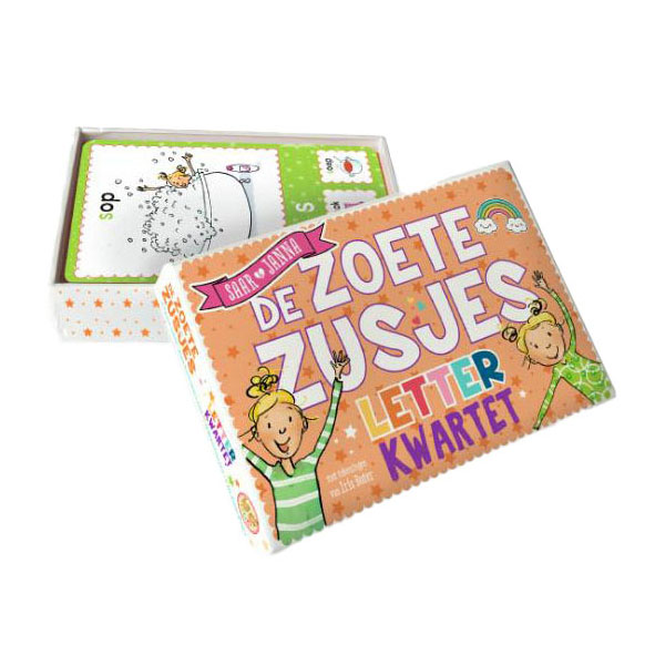 A game of quartet never gets boring! Especially not when you get to play the cheerful 'Zoete Zusjes letter quartet' with the well-known illustrations by Iris Boter. Find the quartets together and win! This fun quartet by Zoete Zusjes Saar and Janna is for toddlers who enjoy working with letters. This way they can practice with letters and words at home in a playful way. This quartet game can be played with letters and words, but also with the pictures and by color and is therefore suitable for children from 4 years old. The 32 sturdy cards (8 quartets) with images of the Zoete Zusjes are in a beautiful storage box and were designed by Hanneke de Zoete. Learning objectives: • Recognizing and practicing with letters • Linking sounds to letters • Distinguishing sounds in words