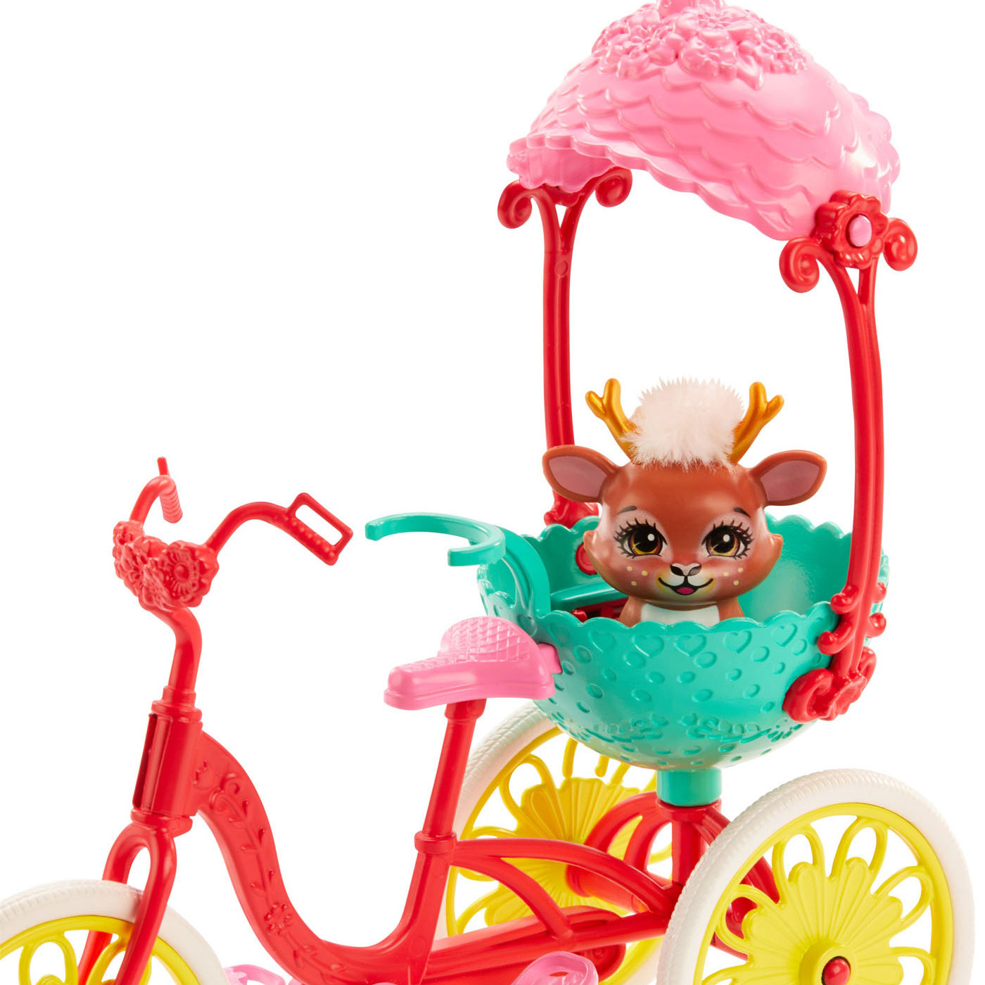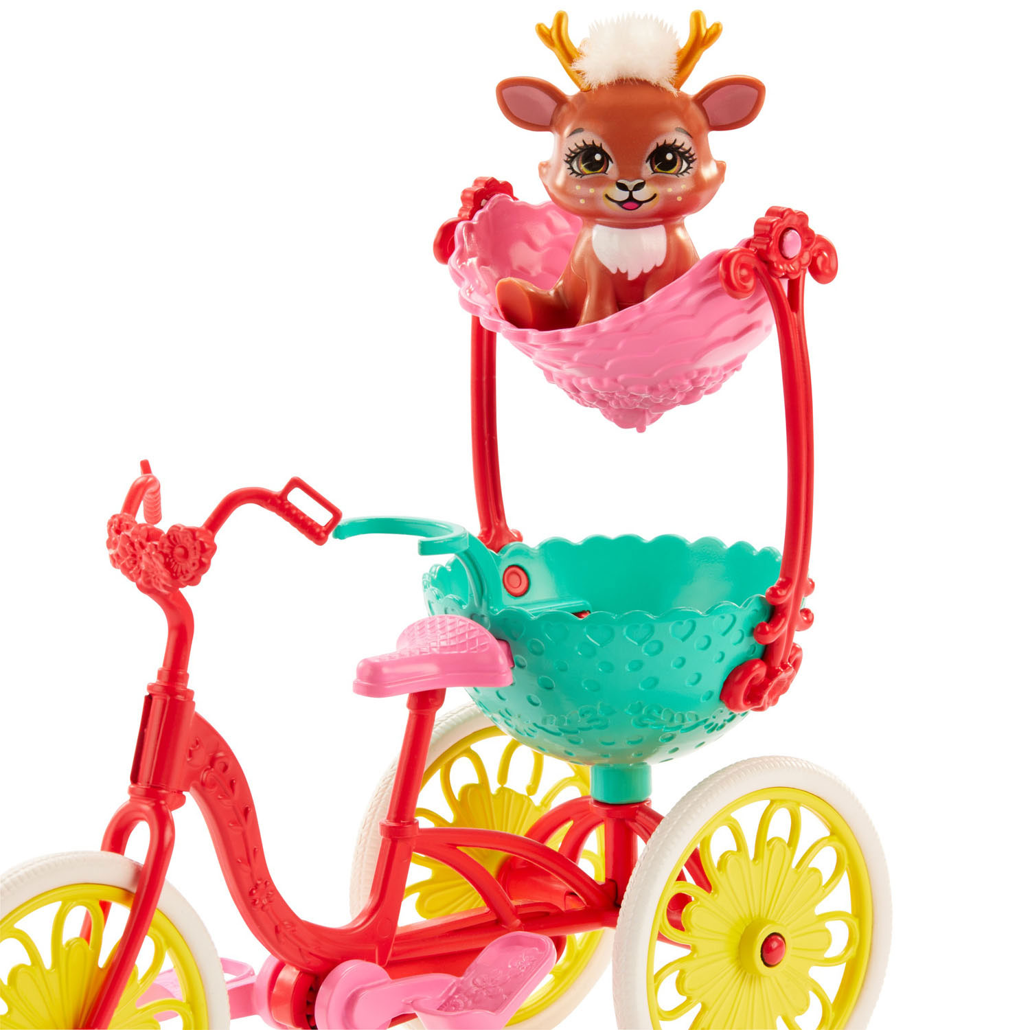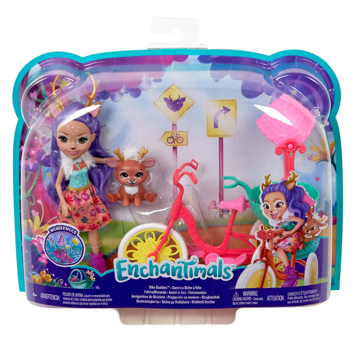 Hop on a bike with Danessa Deer and ride into the fantastic world of the Enchantimals with this playset! This 2-wheeler (28 cm) with cheerful flower wheels is ready to take your best friends on all kinds of adventures. Danessa Deer (15 cm doll) has movable legs so she can sit and 'pedal', and her hands can really 'hold' the handlebars! Sprint fits perfectly in the cozy basket. Give them a push and let the journey begin! Includes doll, animal figure and bike. Playsets sold individually depending on availability. Colors and decorations may vary.