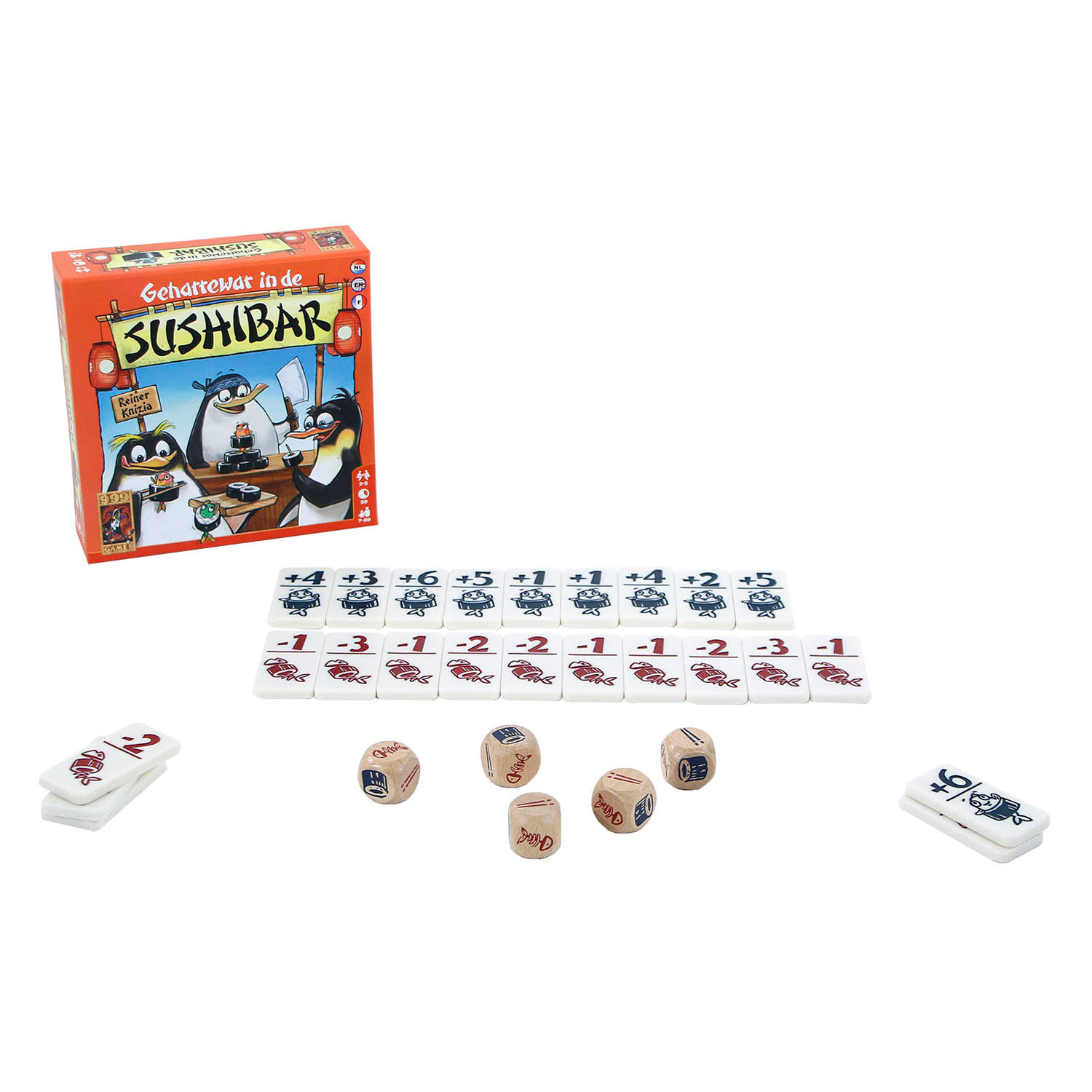 "Geharrewar in de Sushibar" (Harry in the Sushi Bar) is a fun dice game for 2 to 5 players ages 7 and up. Collect sushi tiles and bone tiles by rolling the dice and make clever combinations to score points. The game has a push-your-luck element and is made of cardboard and plastic.