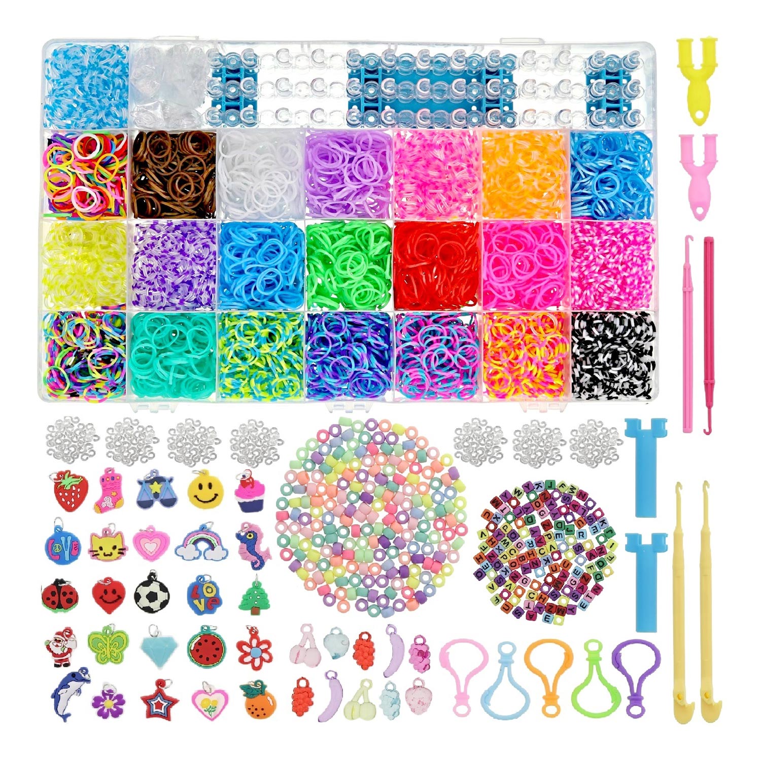 Loom Storage Box, 6,380 pieces. Contents: 5,500 loom bands, 500 S-clips, 200 braiding beads, 130 letter beads, 5 backpack clips, 25 pendants, 10 pendants (transparent), 2 weaving hooks, 2 crochet hooks, 1 adjustable loom board and 2 Y-looms.