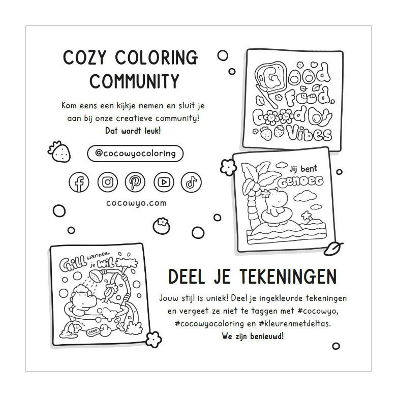 Take some time for yourself with this cozy coloring book from Coco Wyo! Official Dutch edition. Get cozy with this coloring book; grab your favorite drink and your markers, and you're ready for a delightful afternoon full of cozy vibes and creative coloring fun. The book features 40 drawings of adorable animal friends and cute scenes waiting to be colored in by you. But what makes this book truly amazing are the motivational quotes accompanying the coloring pages. Let yourself be inspired by these while you unleash your creativity and color yourself into complete relaxation mode! The pages are printed on one side of sturdy paper. Ideal for getting started with alcohol markers! Thanks to the sturdy paper, the ink from your markers won't bleed through, allowing you to create beautiful, smooth color transitions. - 45 hand-drawn coloring pages waiting for your creativity - Single-sided printed pages on sturdy 140 gsm paper - Convenient size with flaps, perfect for relaxing anywhere - A beautiful edition in Dutch with a lovely matte cover - Ideal as a gift for coloring enthusiasts of all ages