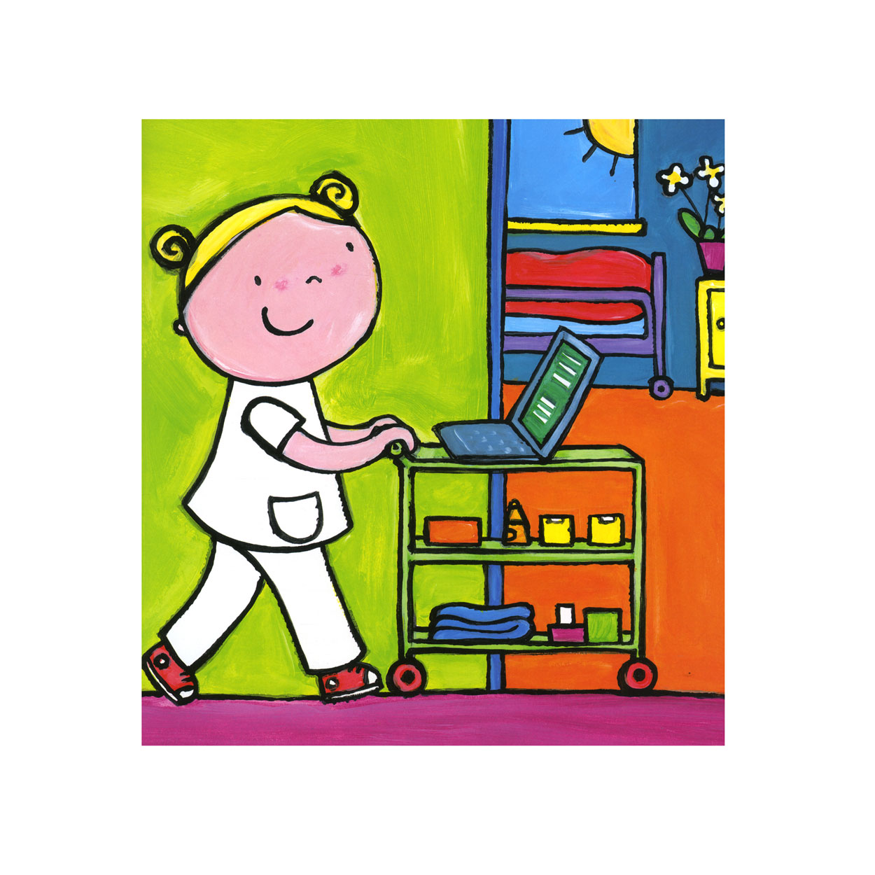 The nurse often works in the hospital. There she takes care of the sick or patients. She measures their temperature and blood pressure. Or she brings medicine and checks how they are doing. The nurse discusses with the doctor how each patient can best be cared for. But a nurse can also do other work: helping with an operation, taking care of elderly people in a nursing home or visiting patients at home.