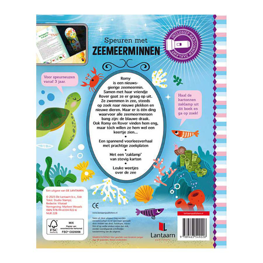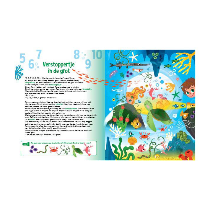 The book begins with fun facts and trivia about the sea. Here you'll also find the cardboard flashlight. You'll need this flashlight for the following pages. The story contains colored words that you can search for on the right-hand page. But you can only do this with the flashlight! Slide it under the black page and you'll see a beam of light appear, allowing you to see everything Romy and Rover experience. Check out the other titles in this series!