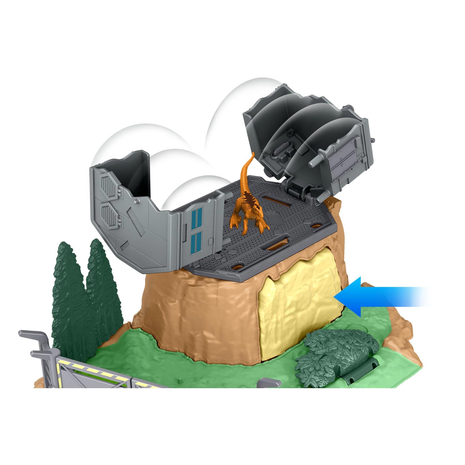 Experience the thrilling action and adventure of Jurassic World: Dominion with this mini playset based on Biosyn Valley from the movie! The playset features a puck launcher, swinging gates, movable shrubbery, and a hilltop building for a dinosaur to hide in. The hideout then breaks in half to reveal the dinosaur! The multiple play areas in this set provide hours of dinosaur fun. The set includes two mini dinosaurs, including the GIANT DINOS making their debut in Jurassic World: Dominion, ready to cause some serious mayhem—launch and destroy! This mini playset also combines with the Mosaurus Chaos playset and is the perfect size for Jurassic World Matchbox™ vehicles. A great gift for dinosaur fans aged 4 and up. Colors, sizes, and decorations may vary.
