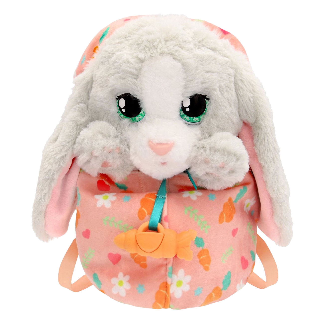 Baby Paws Bunny is the newest member of the Baby Paws family! This adorable bunny loves carrots and has super soft fur with big ears, making it look just like a real bunny! Bunny is sleeping soundly in an orange blanket printed with flowers and carrots. With a pacifier in her mouth and her eyes closed. Open the blanket and discover her soft, flexible body. As soon as you take the pacifier out of her mouth, her eyes open and Bunny will make the sweetest sounds. And if you aren't playing with Bunny, she will ask for your attention. Put the pacifier back in her mouth, and her eyes will close again and you'll hear cute sleeping sounds. Sleep tight, Bunny! The blanket has a handy handle so you can take your bunny with you everywhere! Download the free 'Baby Paws' app, where you can fill out a personal passport for your Baby Paws. This app also has all kinds of interactive features to feed and care for your Baby Paws plush toy. Under the guidance of a veterinarian, you will go through various mini-games to learn how to care for your new puppy. Baby Paws Bunny is your new best cuddle friend! Dimensions: 20 cm tall. Battery information: 2 x AAA batteries (included). Age indication: 18 months+.