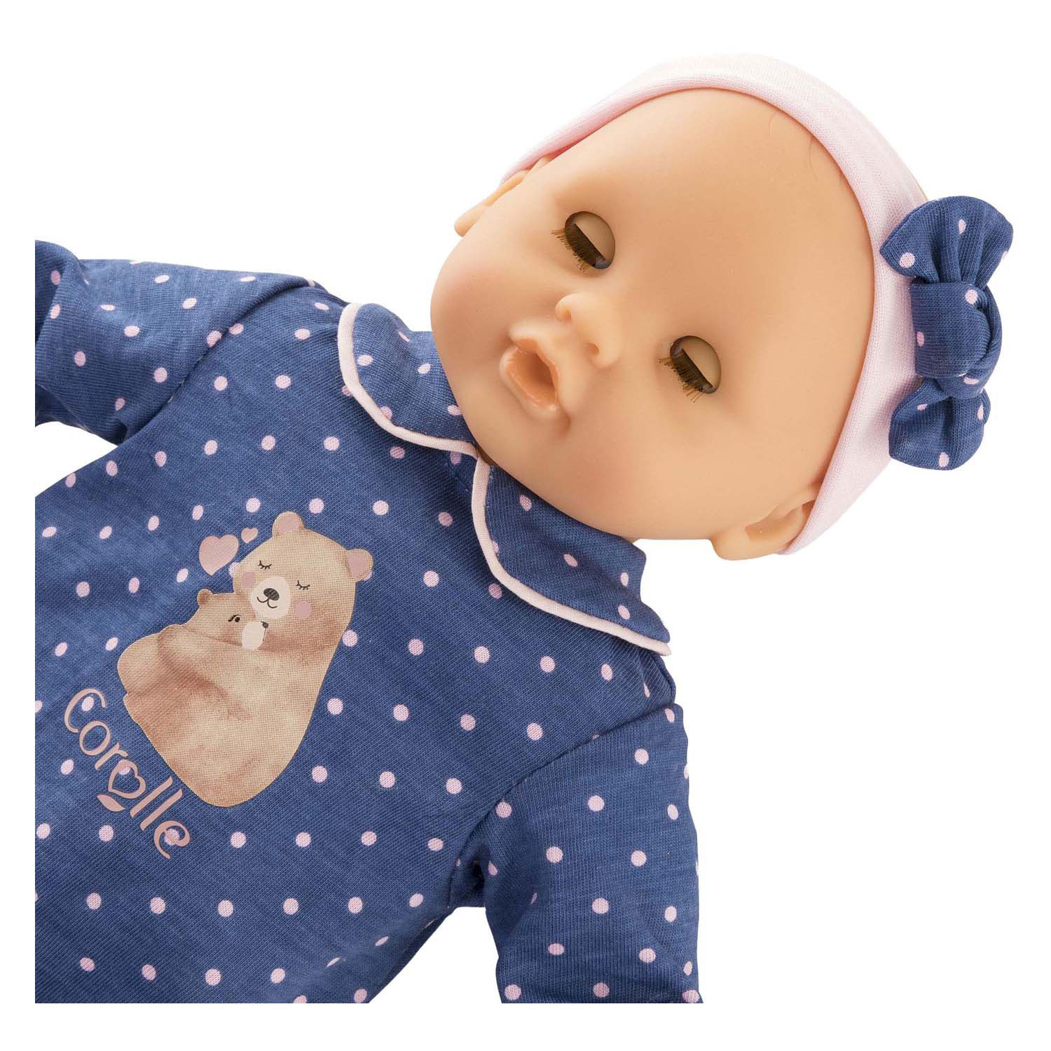 Baby Capucine is a soft, 30 cm baby doll with brown sleeping eyes, vinyl parts, and a subtle vanilla scent. She wears dark blue pajamas with a teddy bear print and a matching headband. Suitable for ages 18 and up.