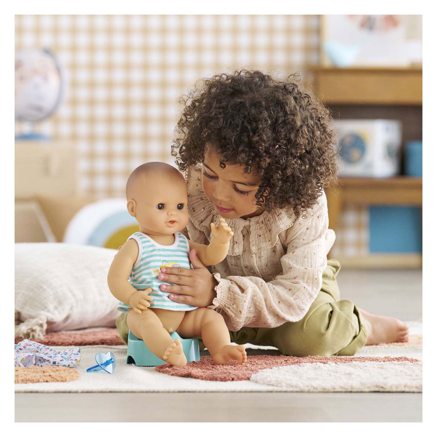 Drinking and Peeing Doll Paul is a realistic 36 cm boy doll who can drink, pee, and take a bath. He has a vinyl body, sleeping eyes, and a subtle vanilla scent. Includes bottle, potty, pacifier, and outfit with a truck print. Suitable for ages 2 and up.