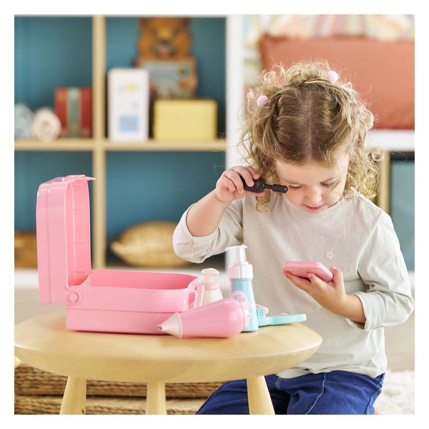 Playful beauty case for children from 18 months, filled with 20 accessories such as a toy hairdryer, comb, brush, lipsticks, and much more. The sturdy plastic case, measuring approx. 25 x 18 x 10 cm, is easy to carry and ideal for role-playing.