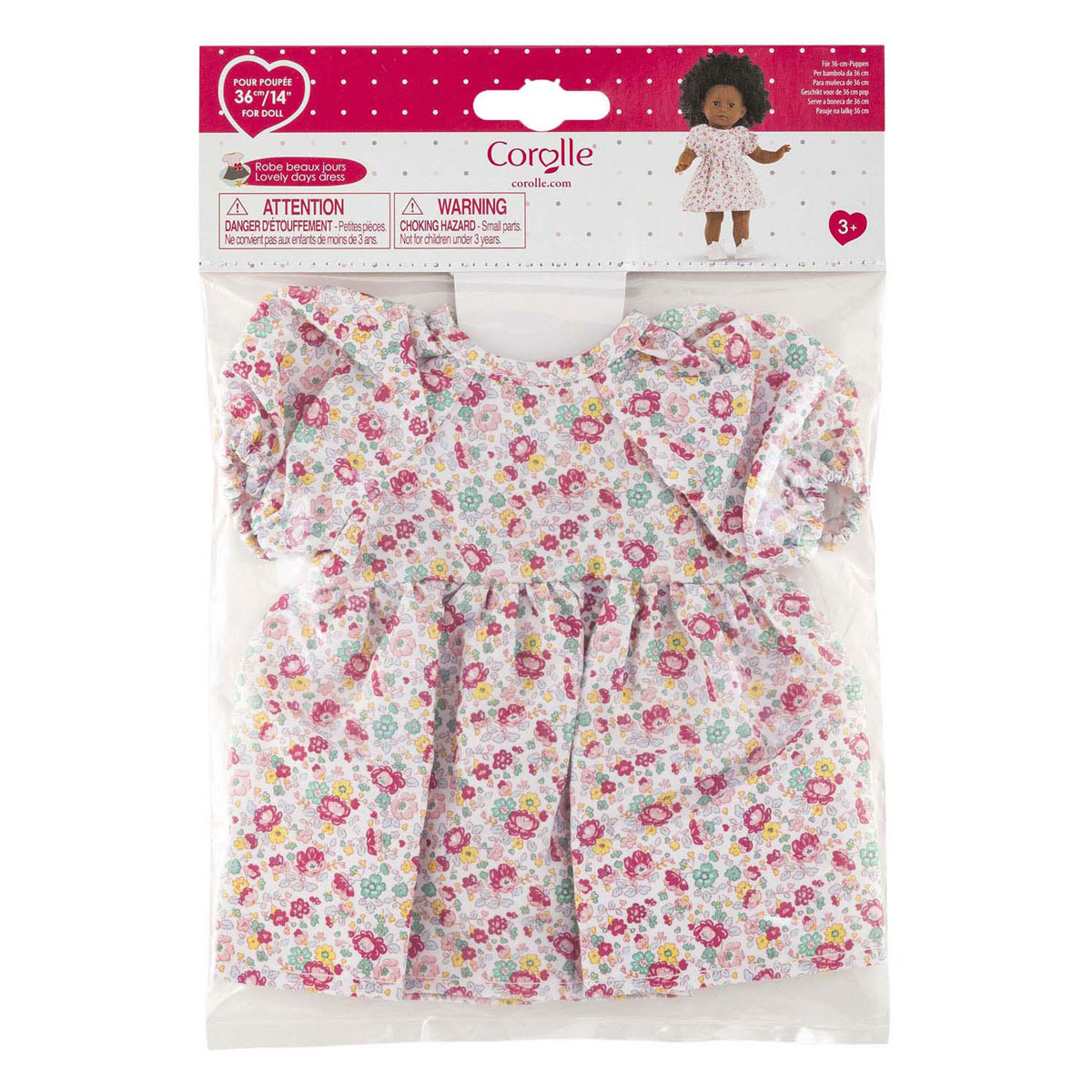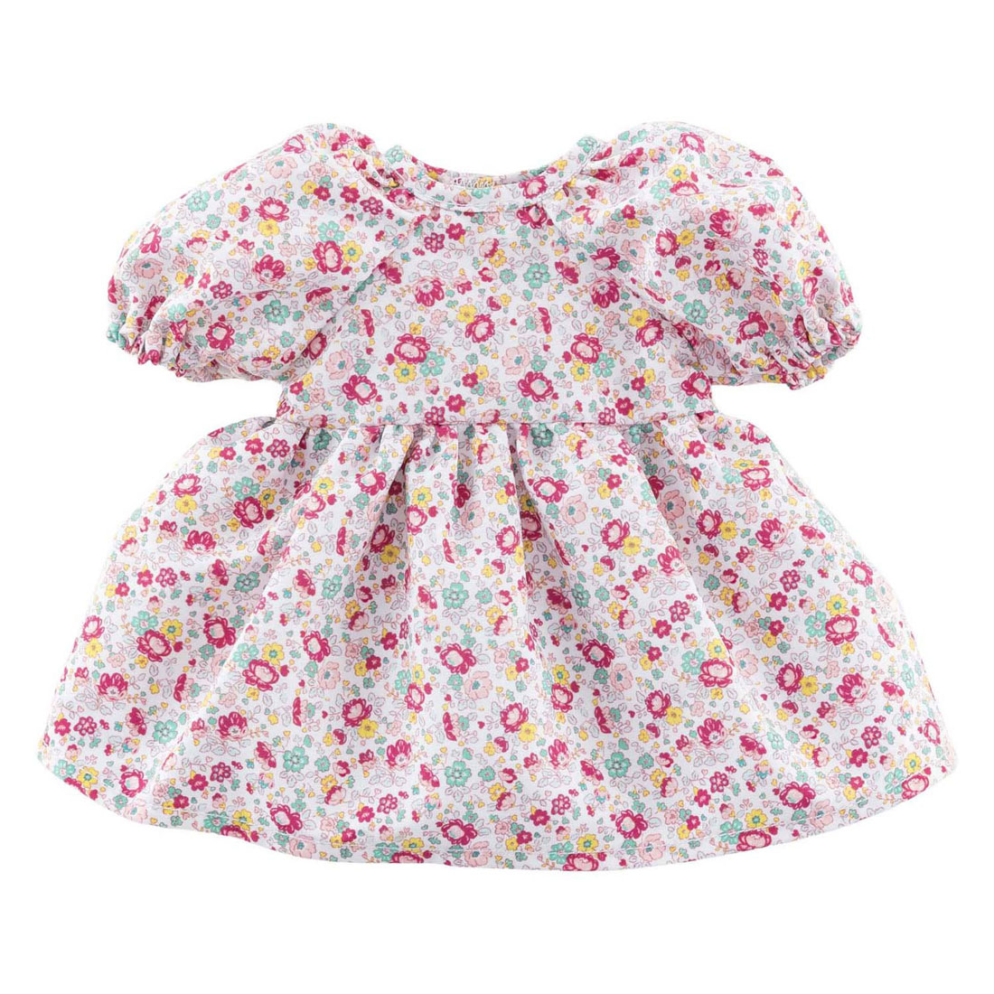 Summer dress with floral print and puff sleeves for 36 cm Corolle dolls. Made of soft fabric and easy to put on with Velcro. Suitable for children aged 3 and up.