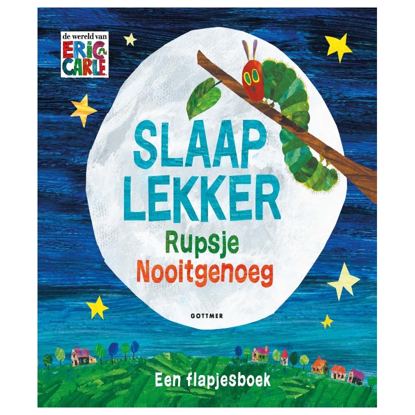 The sun is setting, soon we will see the moon. Who is ready for bed? Not all of the friends of the Very Hungry Caterpillar are ready for bed yet. Look under the flaps and wish them goodnight. And guess who is sleeping on a leaf in the moonlight?