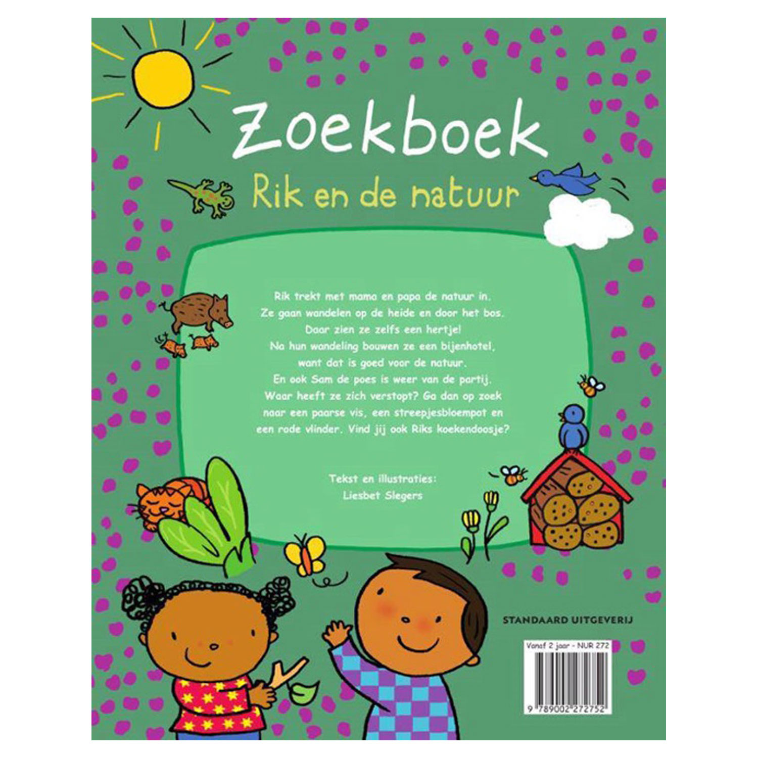 Rik heads out into nature with his mom and dad. They go for a walk on the heath and through the woods. They even spot a deer! After their walk, they build a bee hotel, because that's good for the environment. And Sam the cat is back too. Where's she hiding? Then go look for a purple fish, a striped flowerpot, and a red butterfly. Will you find Rik's cookie box?