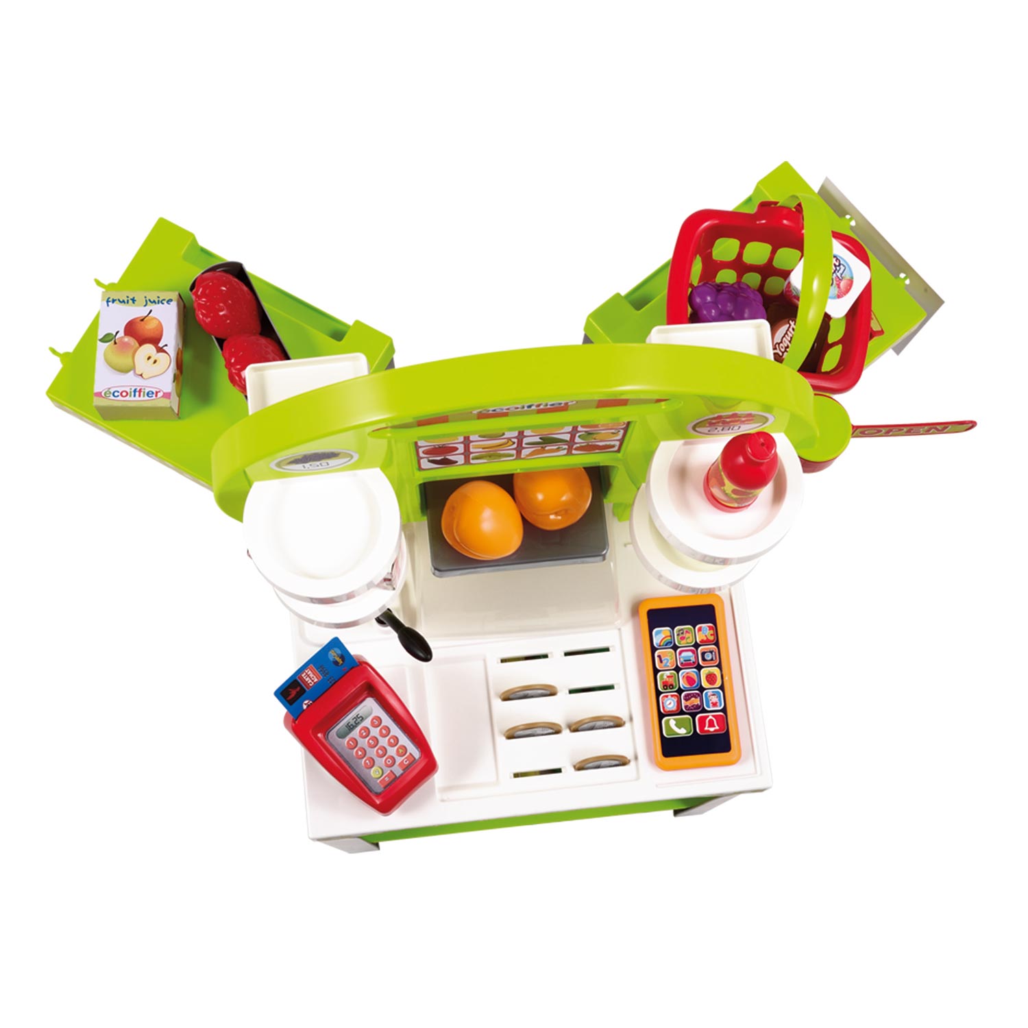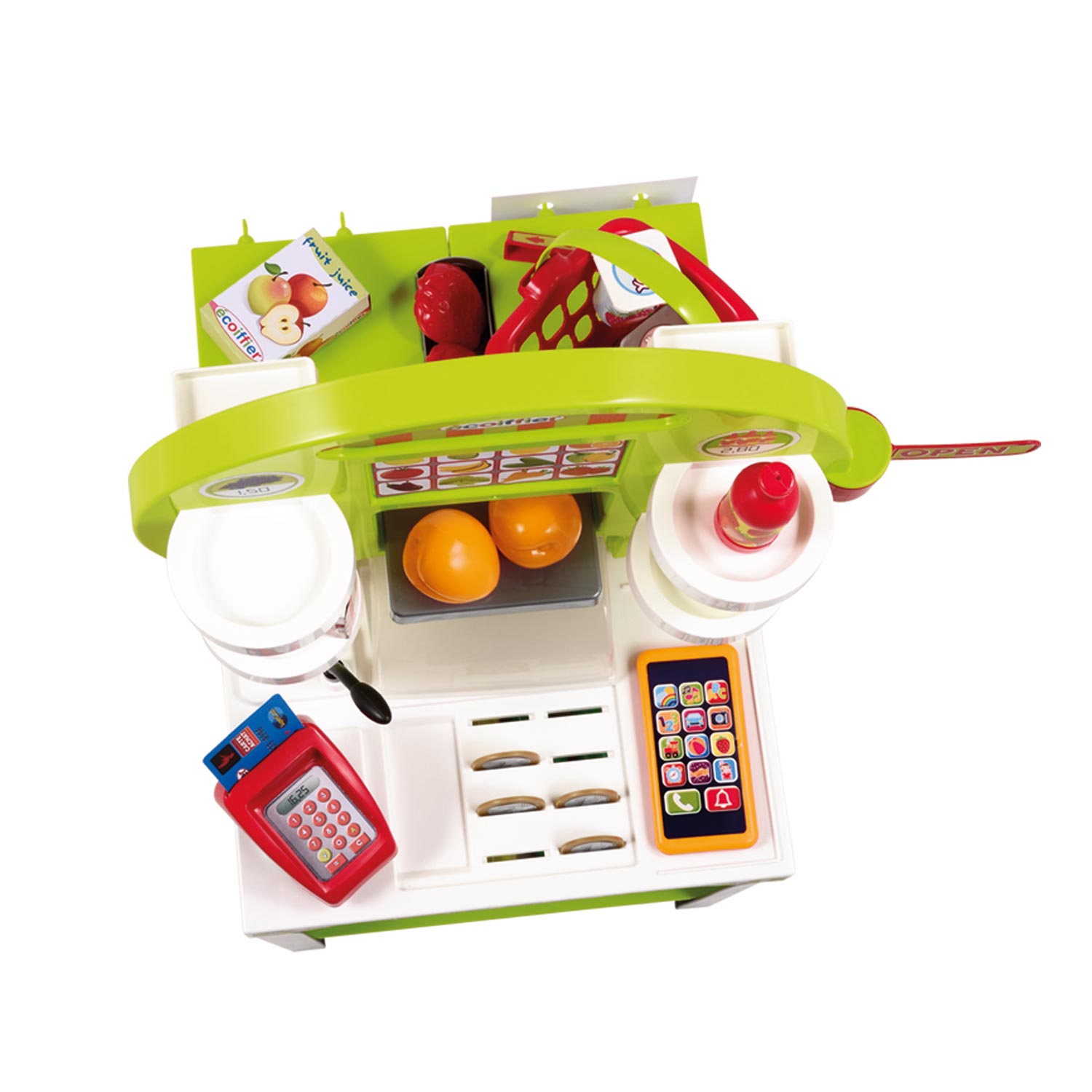This Ecoiffier toy market stall features cheerful colors. The sides of the stall can also be folded, allowing optimal use of both the front and back. The stall is stocked with fun products and handy accessories, such as strawberries, zucchini, carrots, yogurt cartons, drinks, crates, and shopping baskets. Customers can pay with cash or a debit card, helping your child learn to handle money from an early age. Suitable for children 18 months and older.