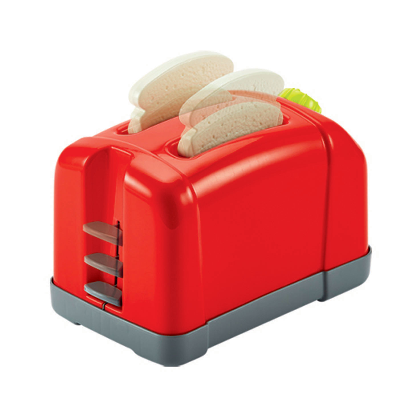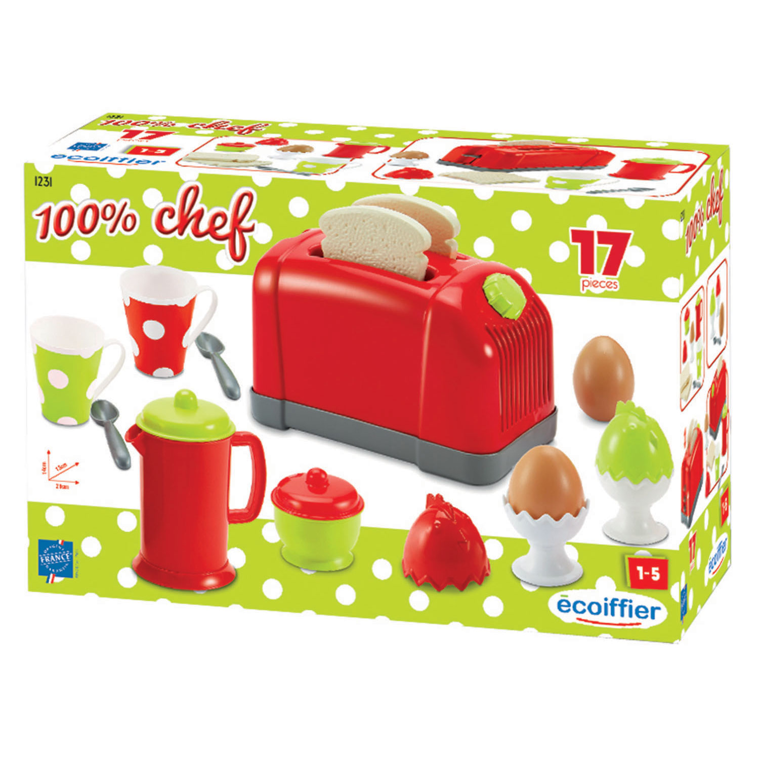 With this 100% Chef Toaster Set from Ecoiffier , you're guaranteed delicious toast every morning. The set also comes with handy accessories, such as eggs and egg cups, two mugs, two spoons, one tea/coffee pot, and one sugar bowl, to complete your breakfast. Made of sturdy plastic.