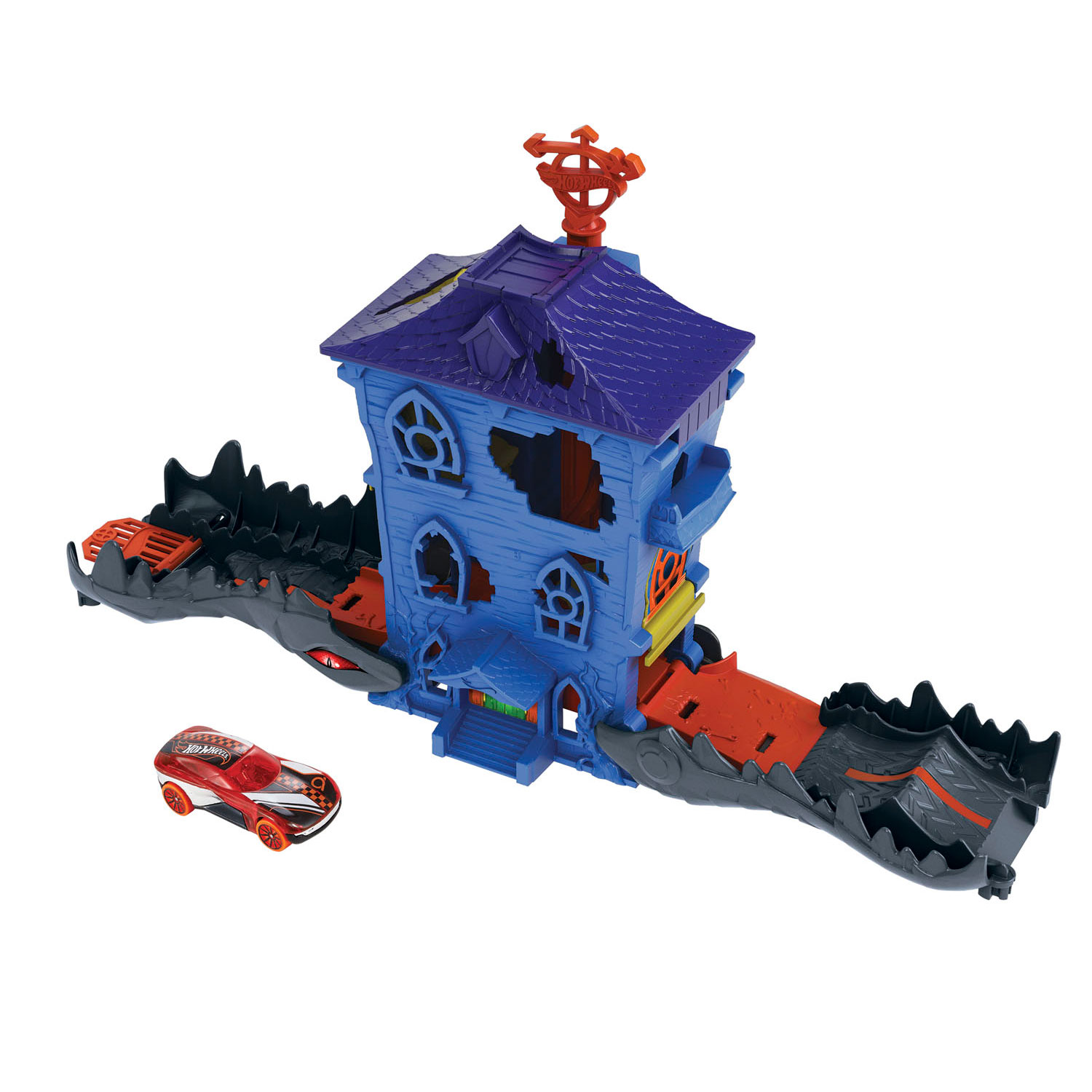 Don't shy away from a fight and perform heart-pounding stunts with your Hot Wheels cars: with this cool set, you'll save the day. Battle the crocodile hiding in the Crocodile Attack in the Workshop Playset, defeat the bat in the abandoned house, and avoid the spider lurking in the park! Avoid getting tangled in the tentacles of the giant squid lurking in the harbor and watch out for the mega scorpion at the restaurant! Each of these 5 Hot Wheels City sets can be connected to other Hot Wheels playsets. Also suitable for use with the orange track. Includes one Hot Wheels vehicle.