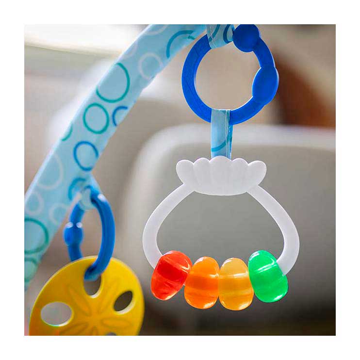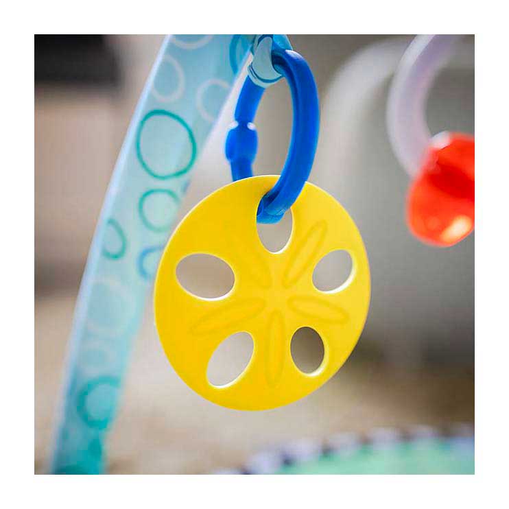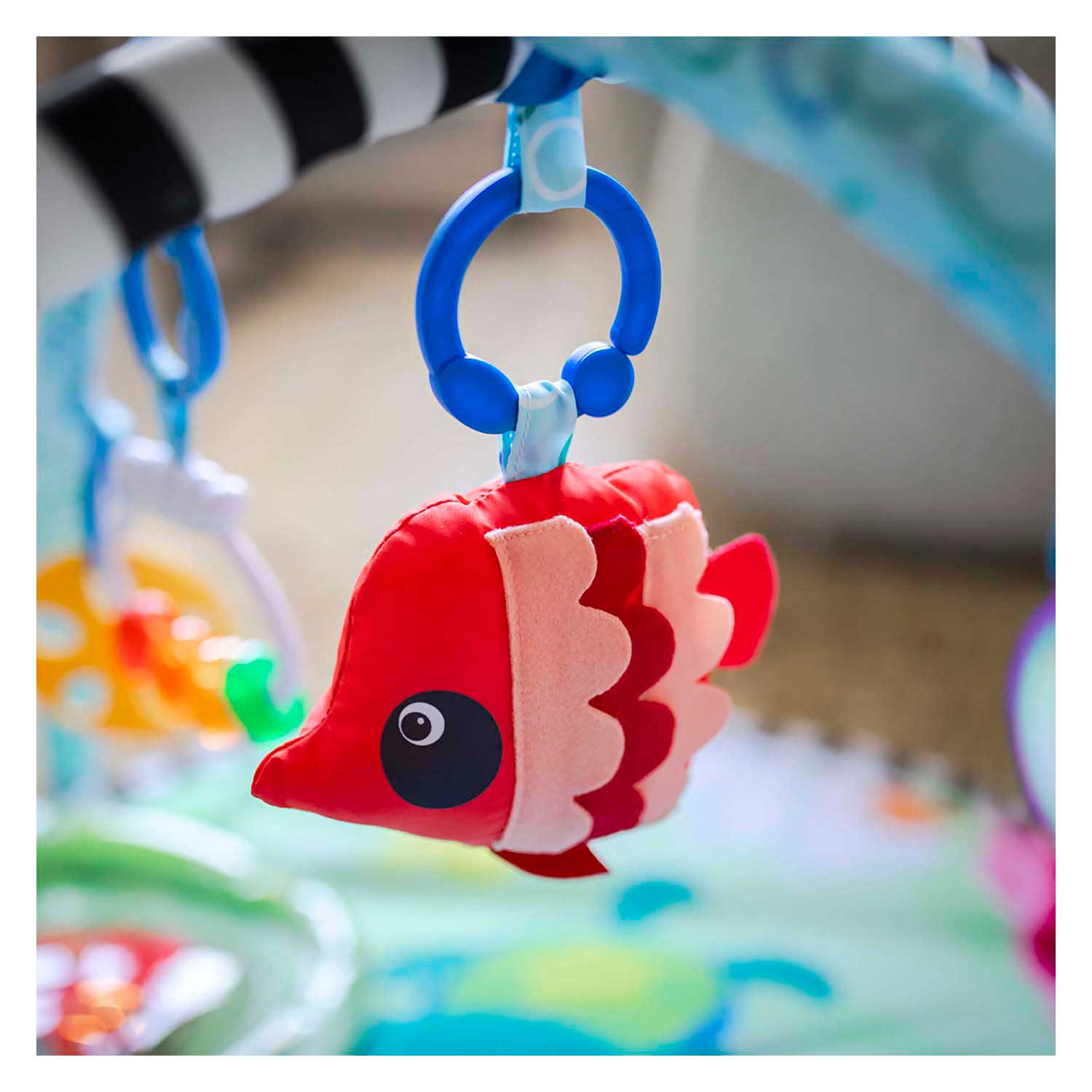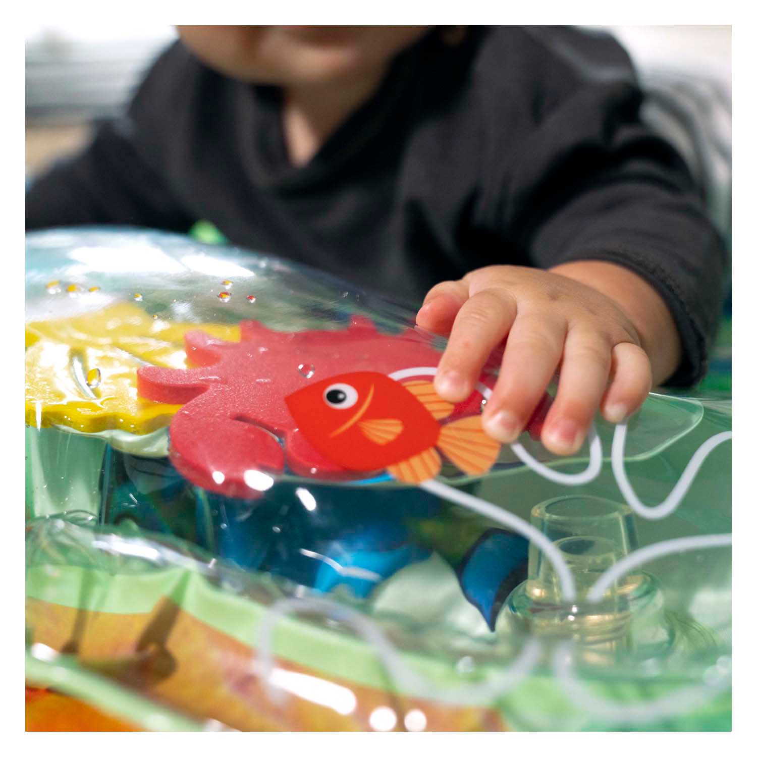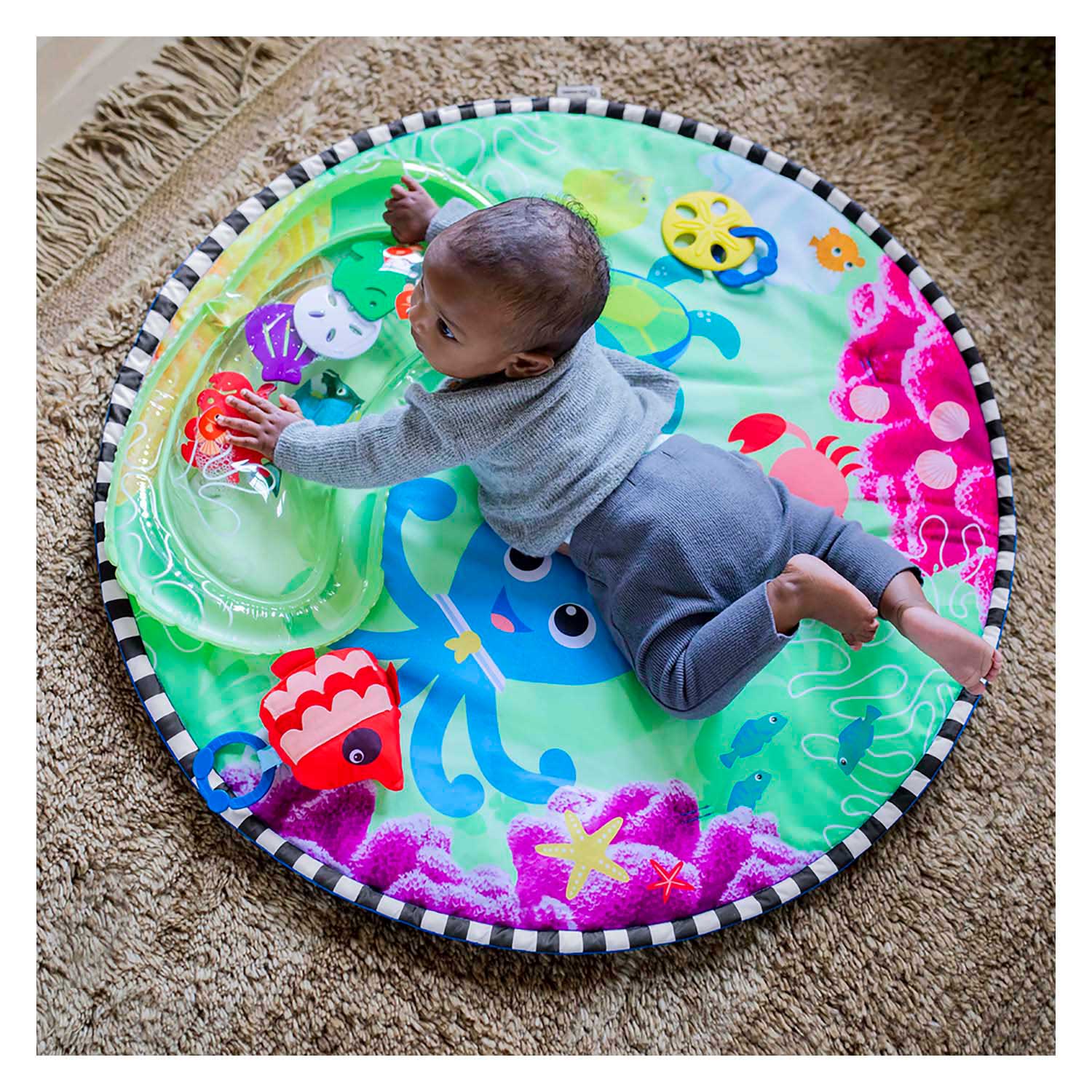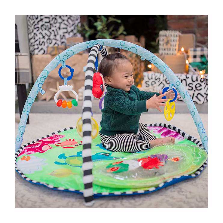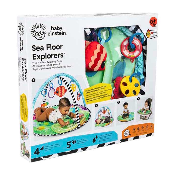 The Baby Einstein 2-in-1 baby gym with water mat offers your baby a versatile and stimulating play experience from birth. With four different play modes, it's perfect for tummy time, lying down, sitting down, and even high chair use! Five detachable toys add variety and stimulate the senses, from a baby-safe mirror to a jingling fish and colorful rings. Features • 4 play modes: tummy time, lying down, sitting down, and high chair use • Mess-free water mat encourages tactile development • 5 detachable toys including a mirror, rattle, and plush fish • Contrasting colors promote visual development • Soft, comfortable play surface for little ones • Includes familiar characters like Opus the Octopus • Easy to clean and folds conveniently for travel • Suitable from 0 months