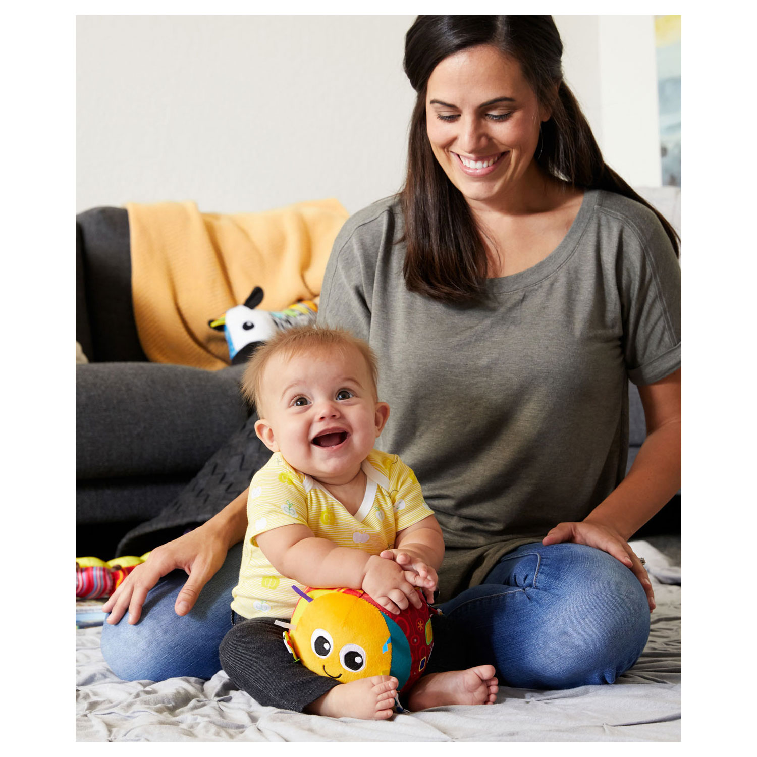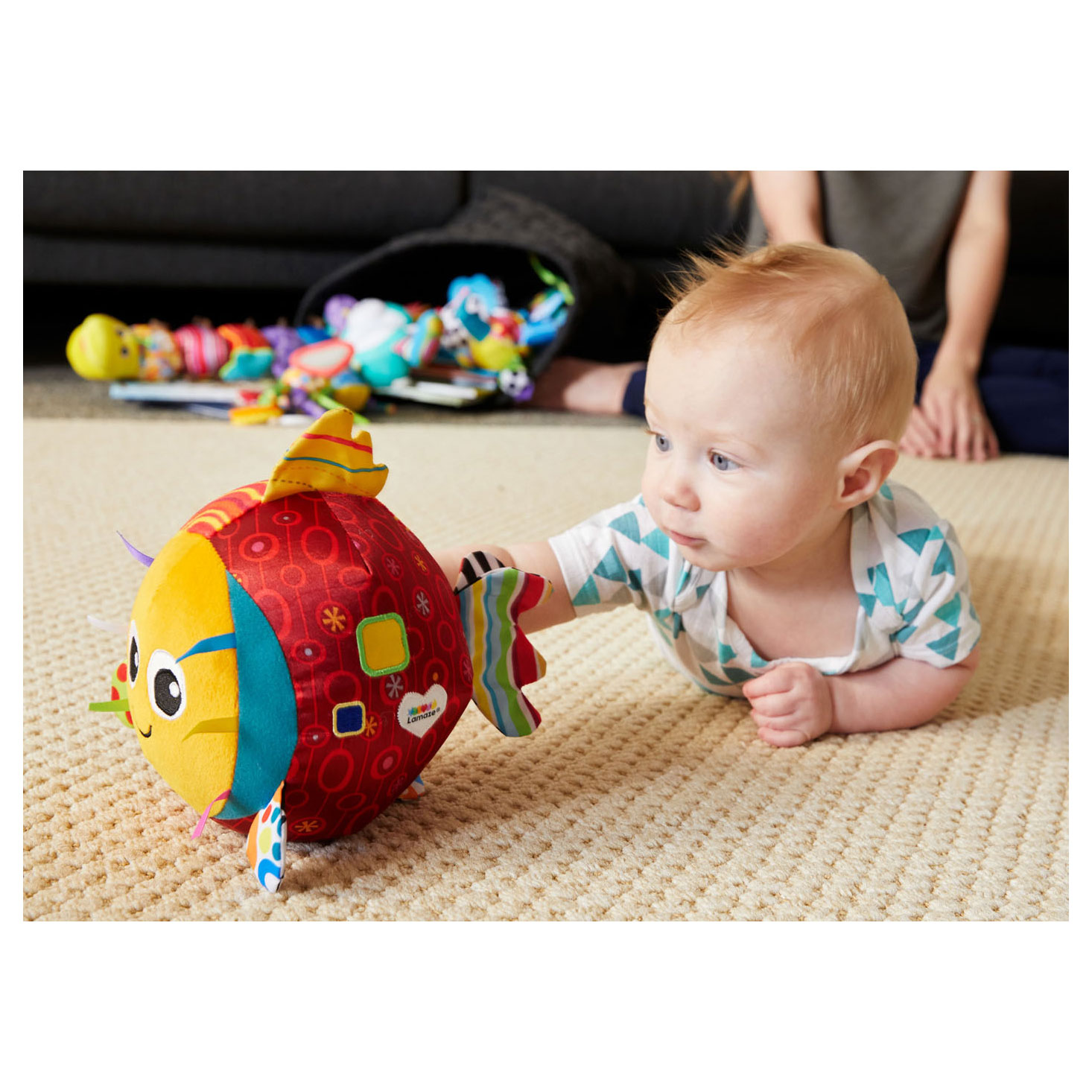 Lamaze Rolling Rosa is a cuddly toy in the shape of a colorful fish. Roll Rosa through the room and she will always return to her tummy, which encourages a child to roll over and crawl after Rosa. Bright, vivid colors and contrasting patterns ensure that a child will concentrate and thus stimulate the eyes. The different fabrics and ribbons that are attached to the toy stimulate the sense of touch and the rustling sounds stimulate the auditory development.