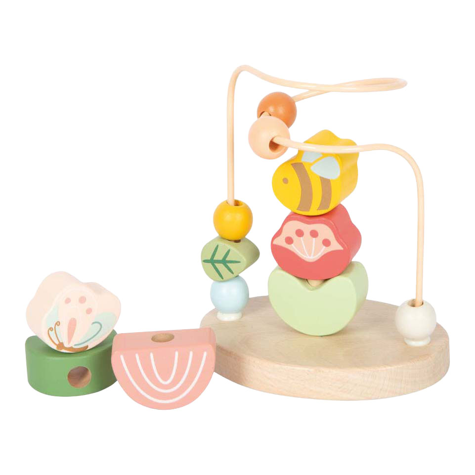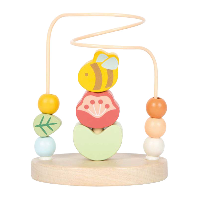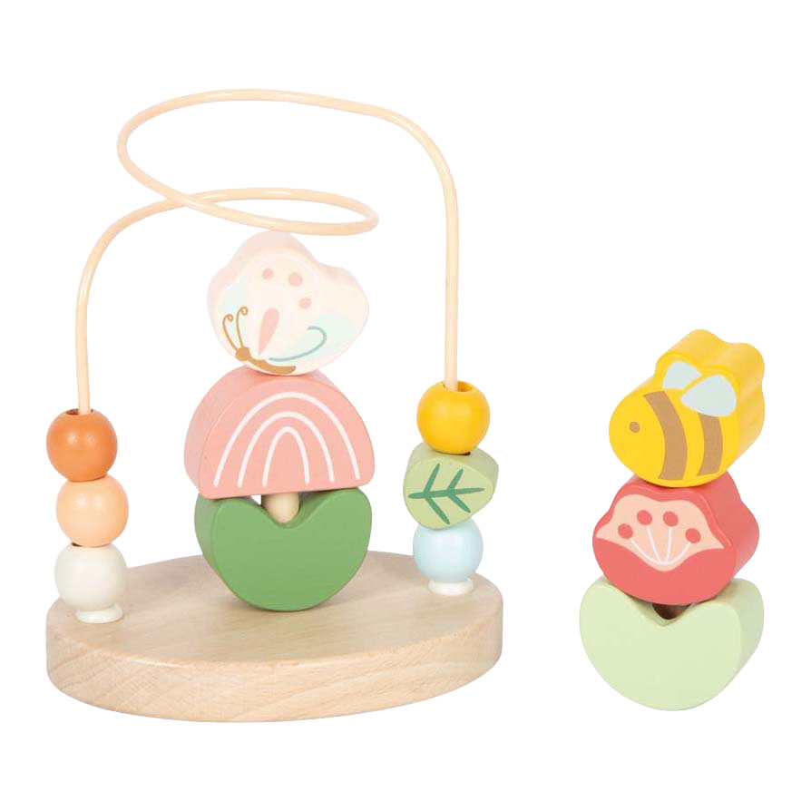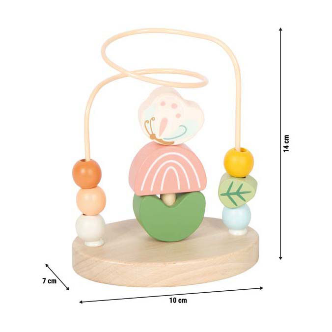 Whether pushing, grabbing, or stacking: fine motor skills are stimulated in a fun way! This handy bead maze combines a loving design with valuable educational benefits, because with its child-friendly design and colorful wooden elements, it offers versatile play stimuli for little explorers. The sturdy metal loop is equipped with six colorful wooden elements that can be moved along the track - ideal for training grasping movements and strengthening hand-eye coordination. And here's a special highlight: in the middle of the loop there is a small stacking game on which three wooden elements can be stacked on top of each other, providing additional play value and further promoting the development of concentration and dexterity! Dimensions: approx. 10 x 7 x 14 cm Recommended age: 12m+
