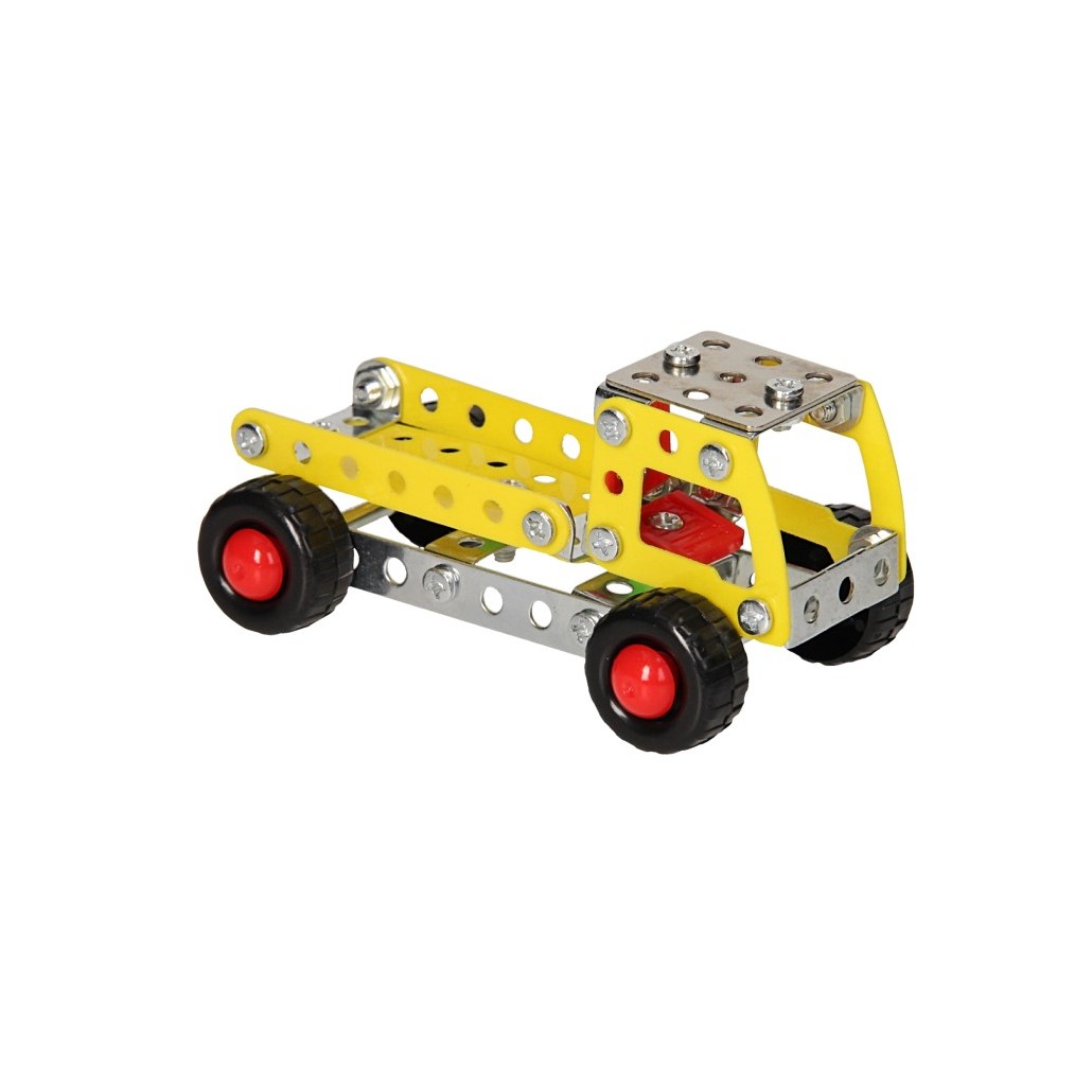 Build your own dump truck with this metal construction set. It contains 83 parts. All you need is a good attitude to get started. Everything you need is included: instructions are on the back of the box, and the necessary tools are included. Happy building!