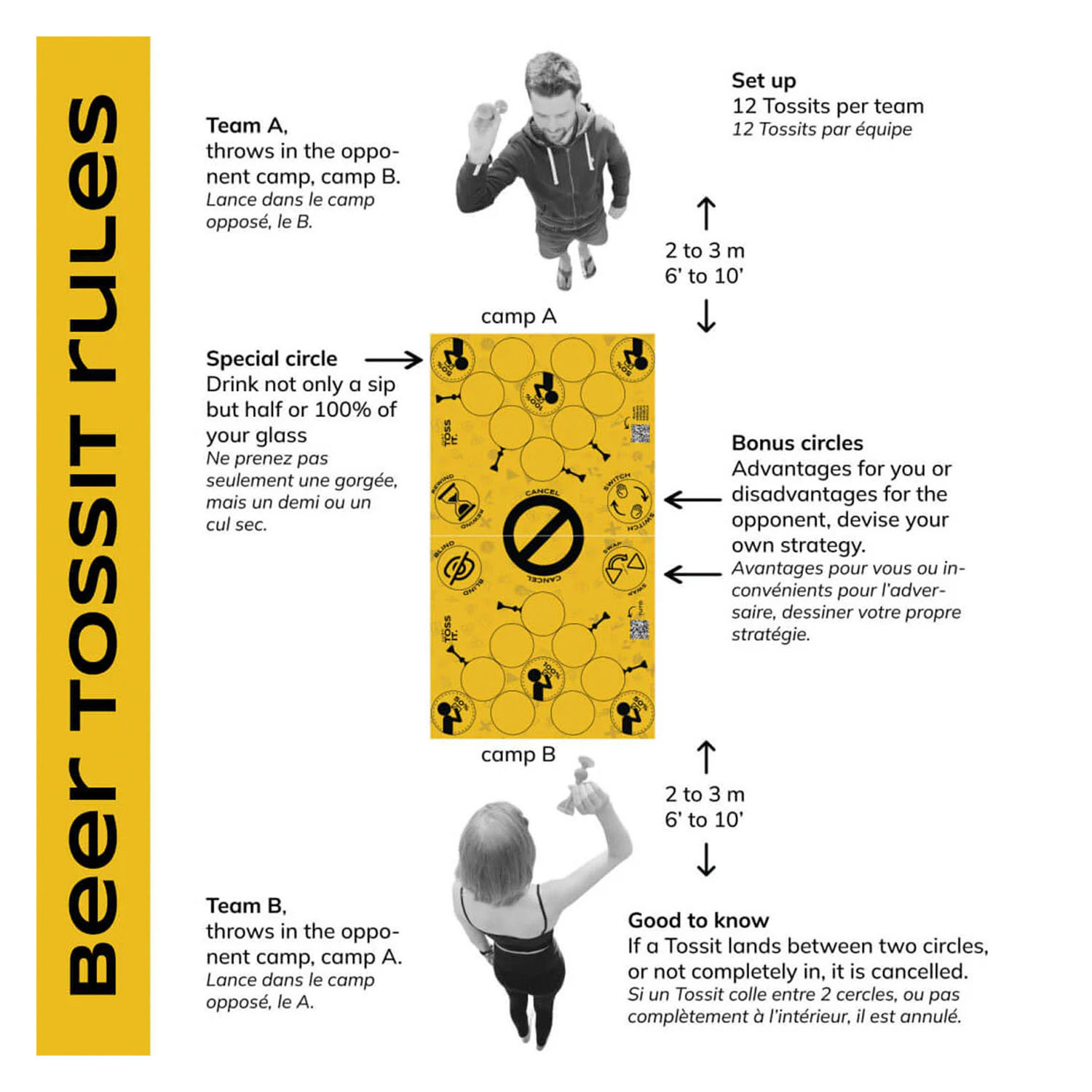 Turn any spot into a playing field and get ready for unforgettable game nights with the PARTY BOARD! Why would you want to play this? • Perfect for parties - Up to 8 players, great for energetic competition. • 9 games in 1 - 3 exclusive modes plus 6 classic TOSSIT game variations. • Roll it up, put it in your bag, and take it anywhere! • Ultra-durable & hygienic • Play anywhere! On the floor, the table, in the garden, on the beach—wherever the party is! The PARTY BOARD is your ultimate key to unforgettable game nights! This ultra-durable silicone board is designed for 4 to 8 players and doubles the fun with two printed surfaces, ensuring a variety of challenges and dynamic gameplay. Side A: Beer TOSSIT - Forget traditional beer pong! In this energetic version, both teams throw their 12 darts simultaneously, aiming at special effect cups to change the game. Fast, fun, and ultra-competitive! Side B: TARGET & RIVER MODE - A mix of strategy and precision, where every roll can change the game. Features • Number of players: 2 - 8 players • Recommended age: from 6 years